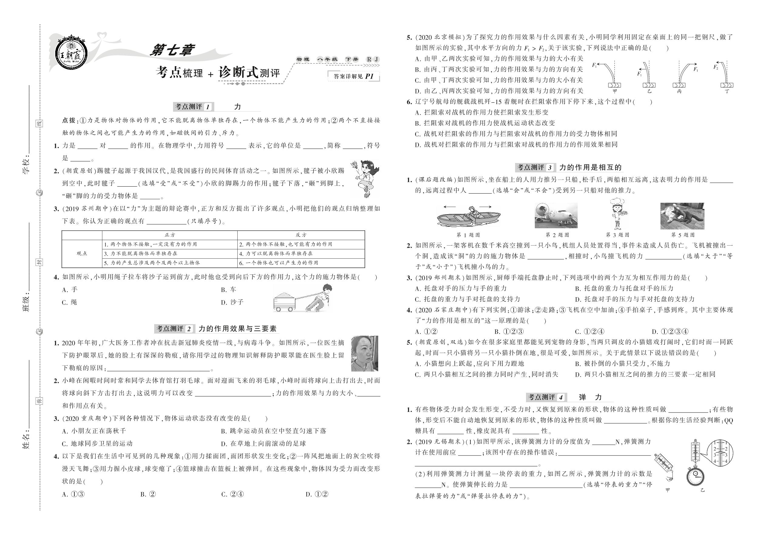 2021下册八年级物理人教版 第七章 考点梳理 + 诊断式测评
