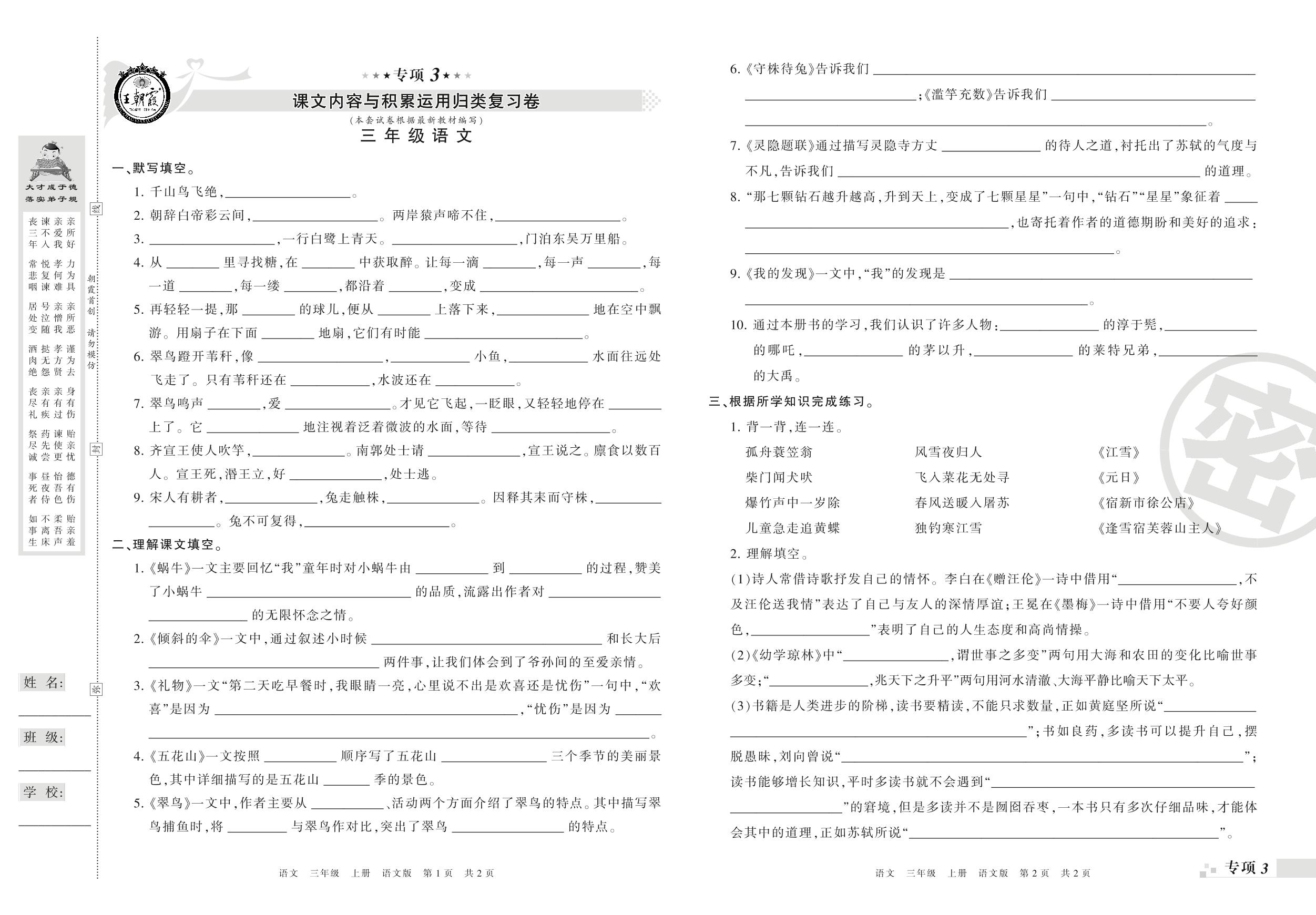 王朝霞期末专项卷——课文内容与积累运用、课内阅读与写作真题归类复习三年级上册语文(语文版)【0】
