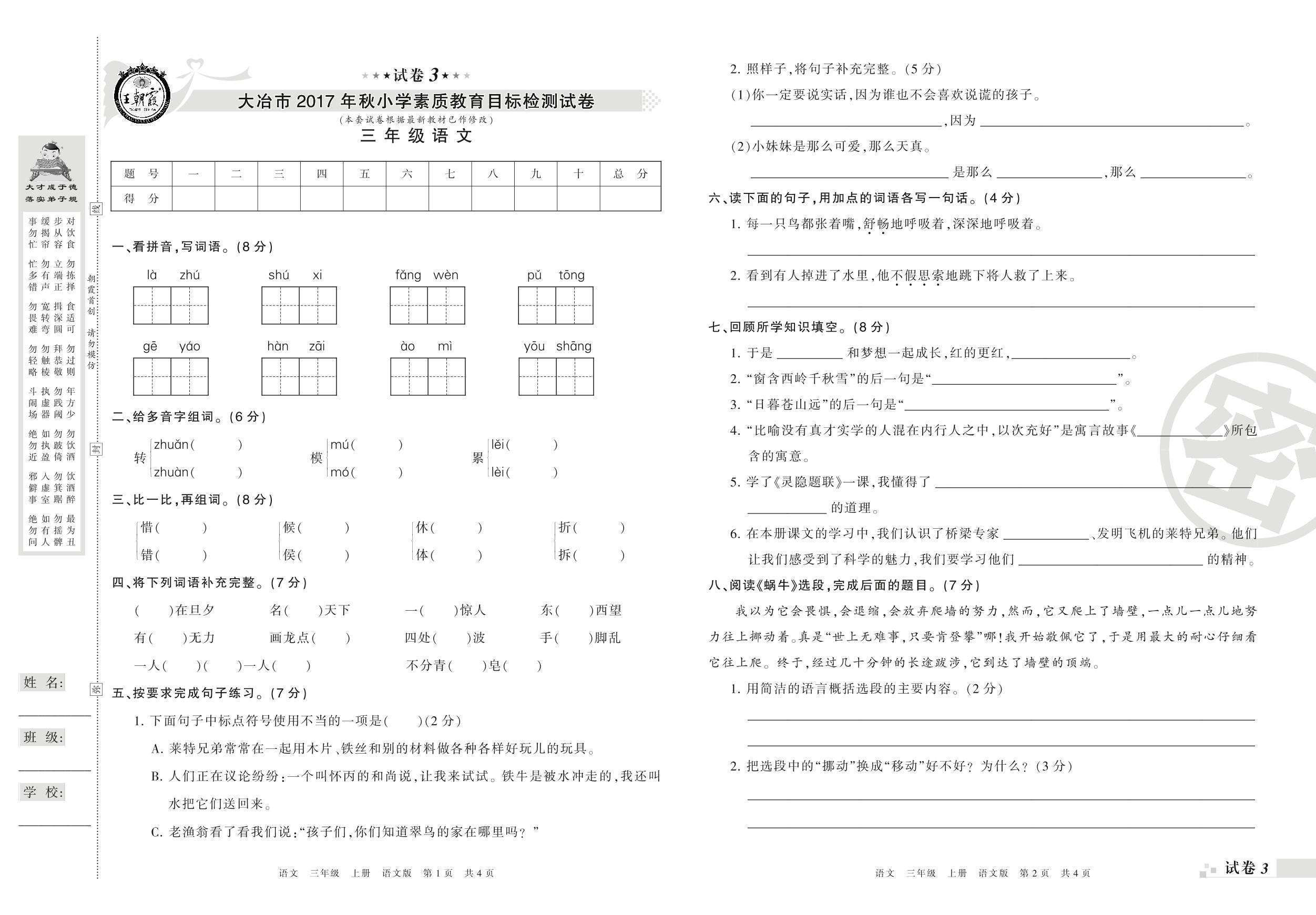 2017-2018学年第一学期大冶市三年级语文试卷(语文版)【3】