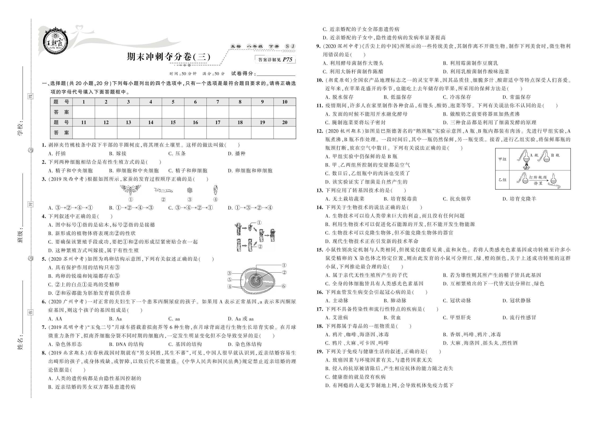 2021下册八年级生物苏教版 期末冲刺夺分卷(三)