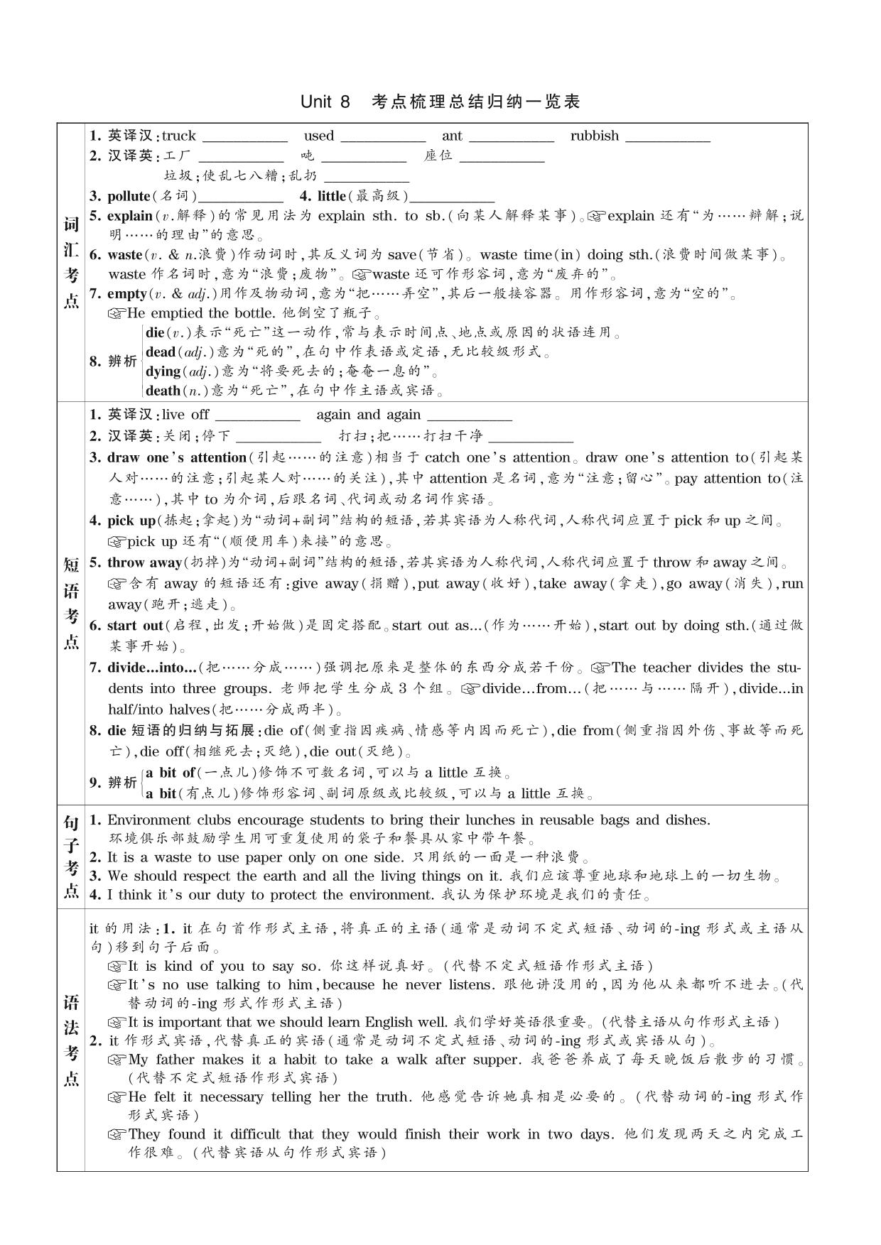 2021下册八年级英语冀教版 Unit 8 考点梳理总结归纳一览表