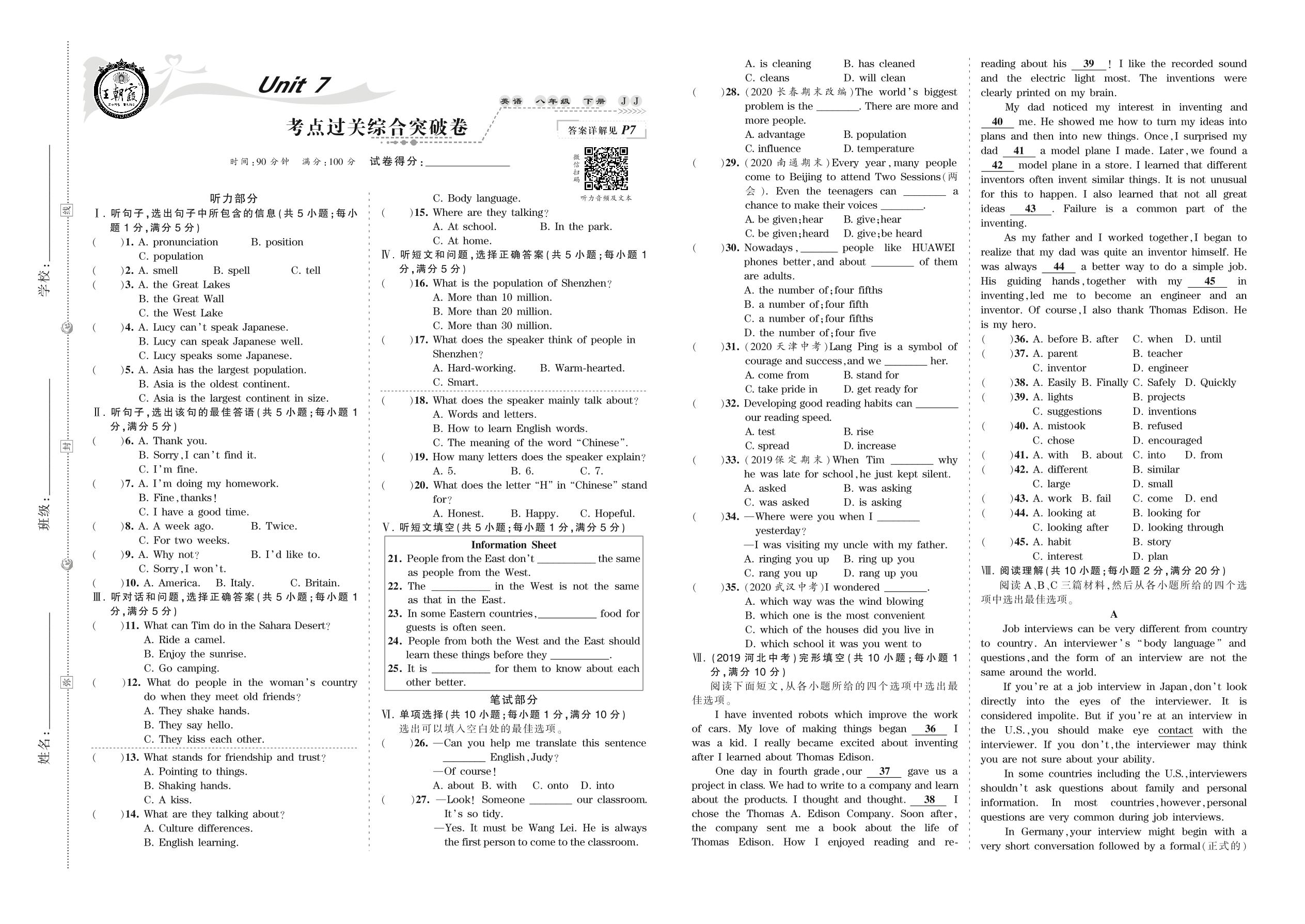 2021下册八年级英语冀教版 Unit 7 考点过关综合突破卷