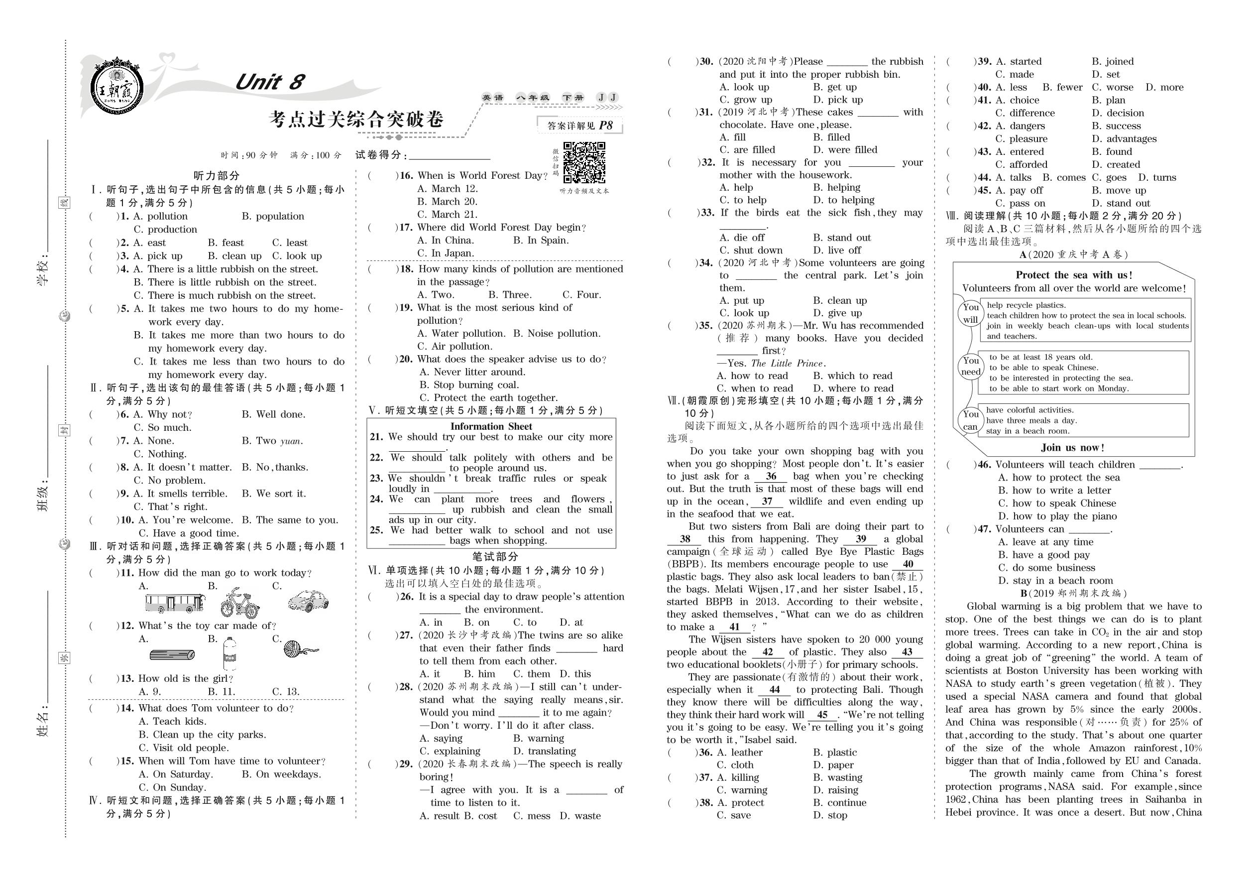 2021下册八年级英语冀教版 Unit 8 考点过关综合突破卷