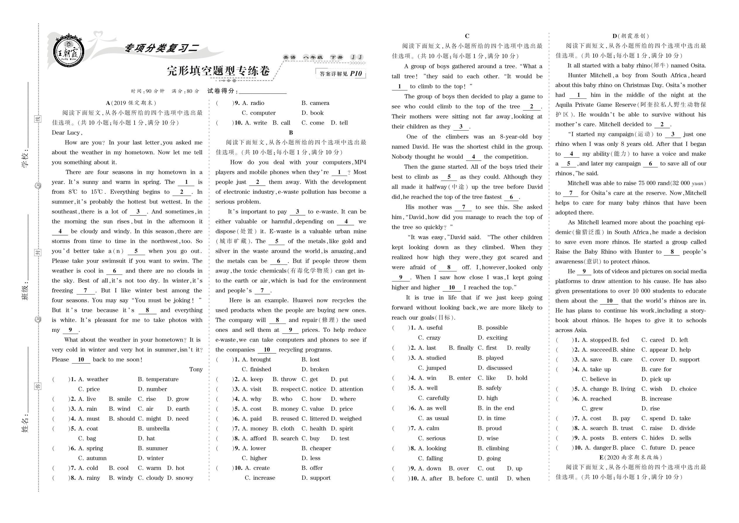 2021下册八年级英语冀教版 完形填空题型专练卷