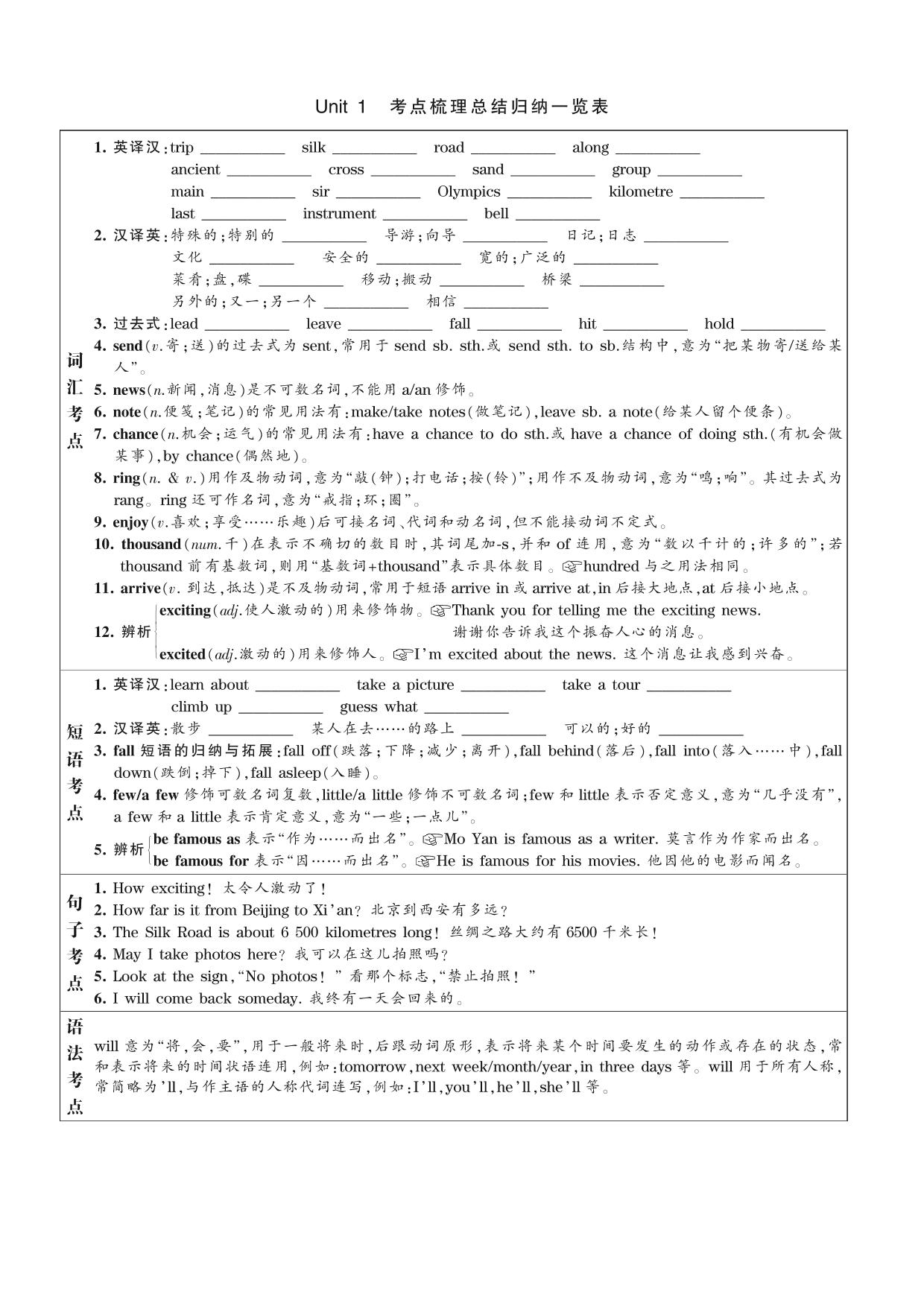 2021下册七年级英语冀教版 Unit 1 考点梳理总结归纳一览表