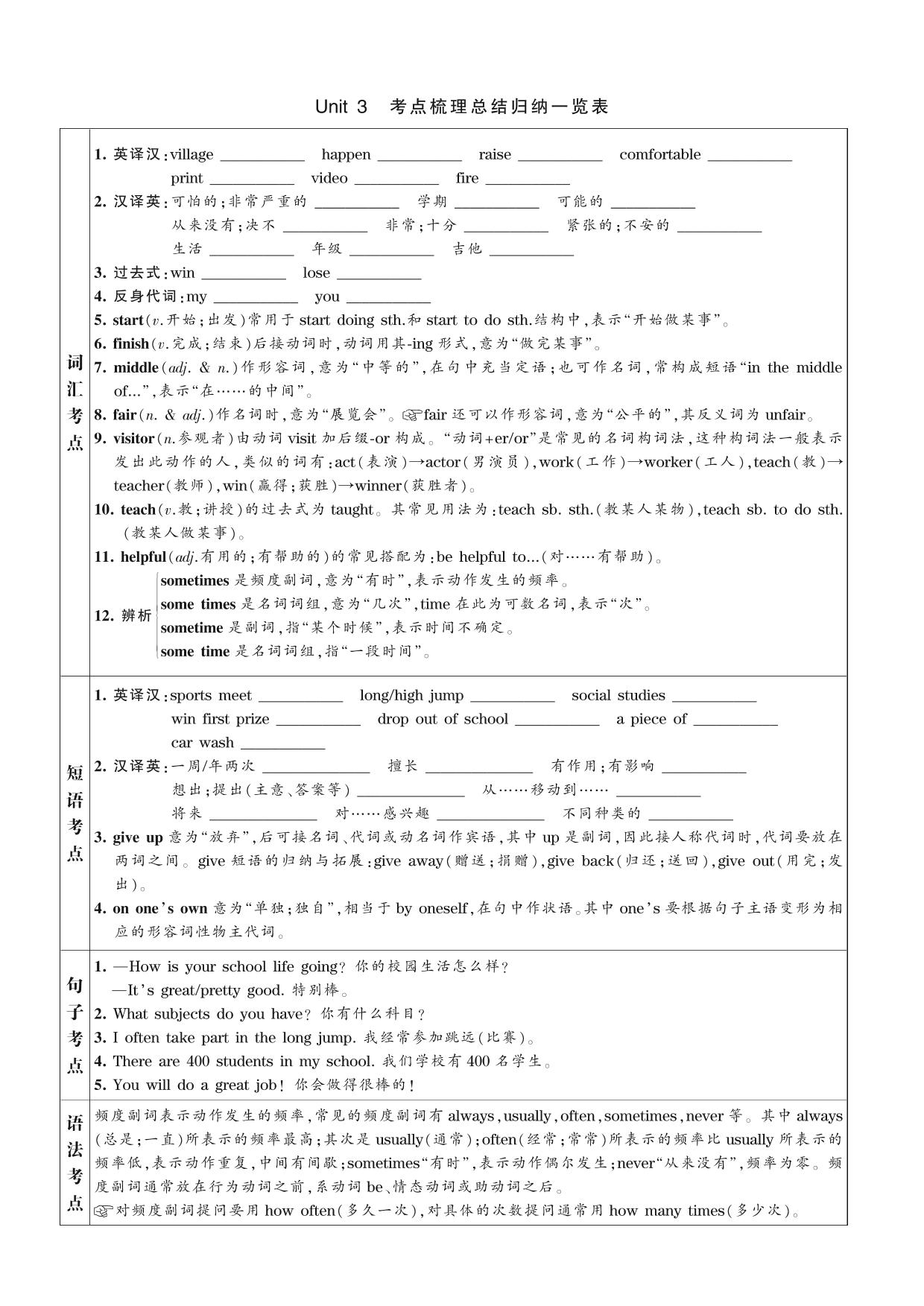 2021下册七年级英语冀教版 Unit 3 考点梳理总结归纳一览表
