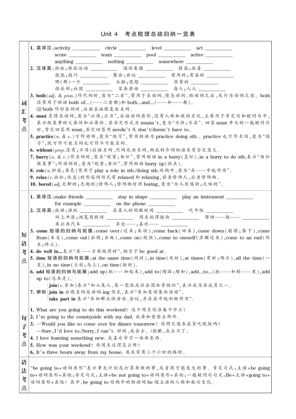 2021下册七年级英语冀教版 Unit 4 考点梳理总结归纳一览表