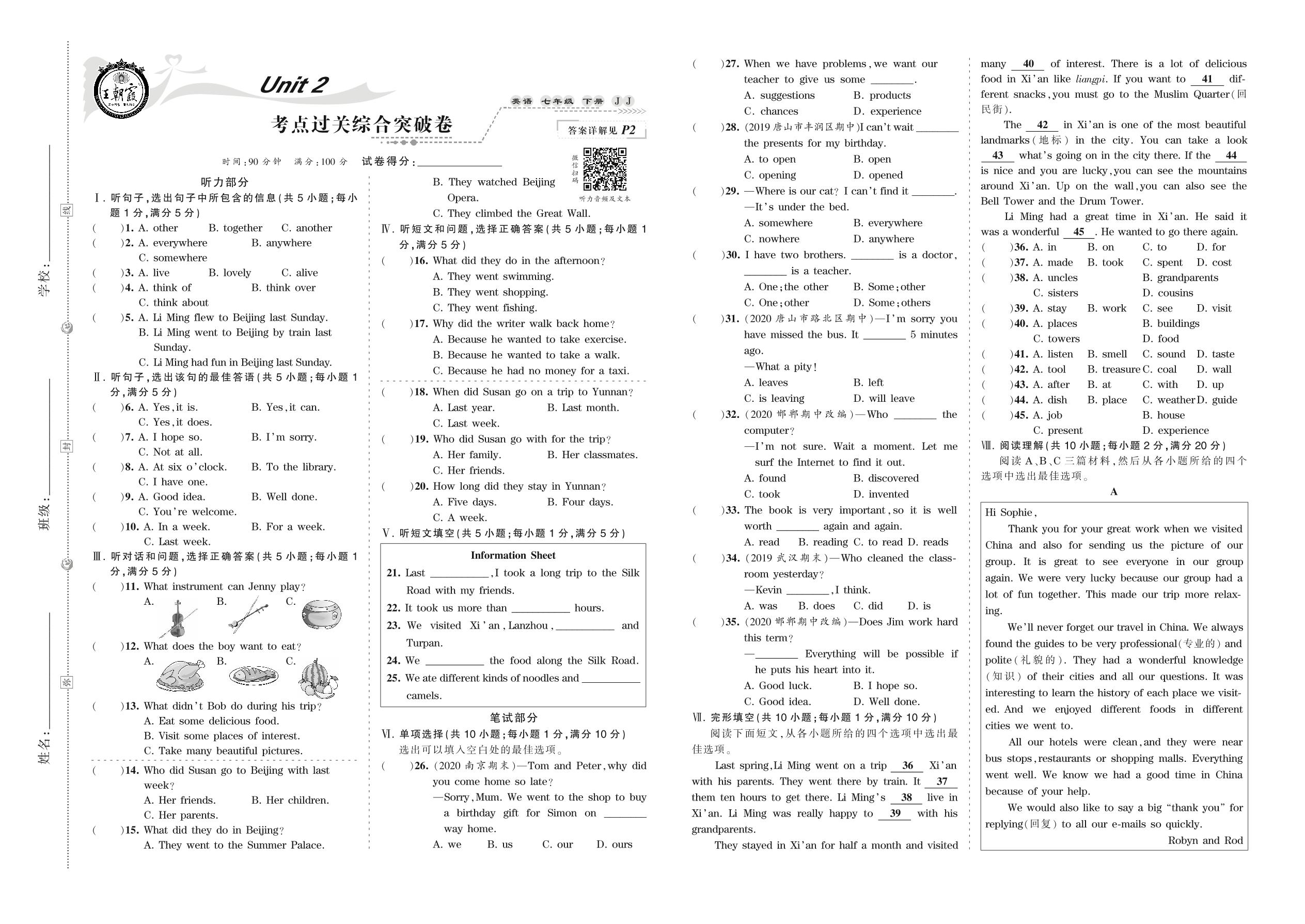 2021下册七年级英语冀教版 Unit 2 考点过关综合突破卷