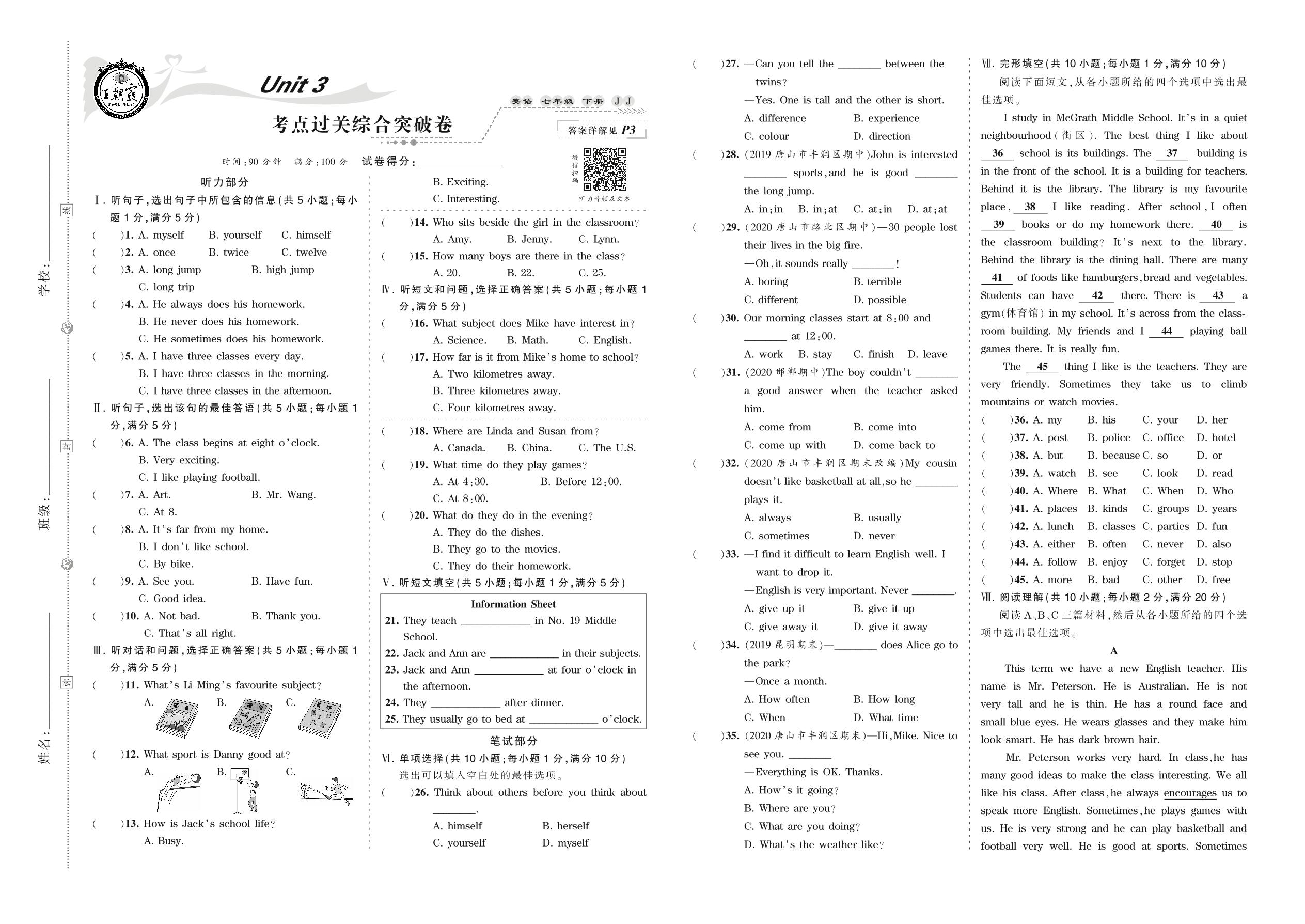 2021下册七年级英语冀教版 Unit 3 考点过关综合突破卷