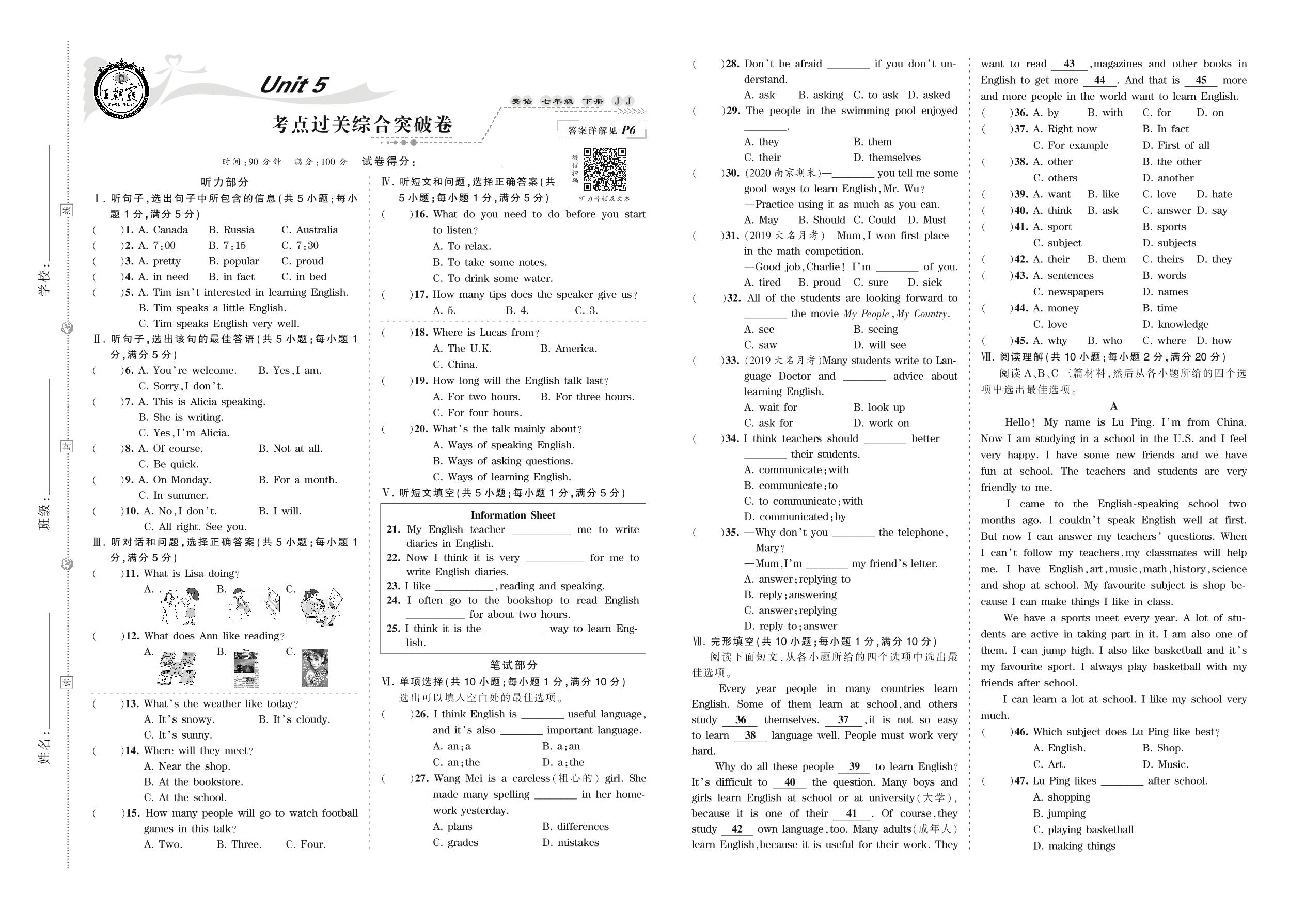 七年级英语冀教版下册单元卷