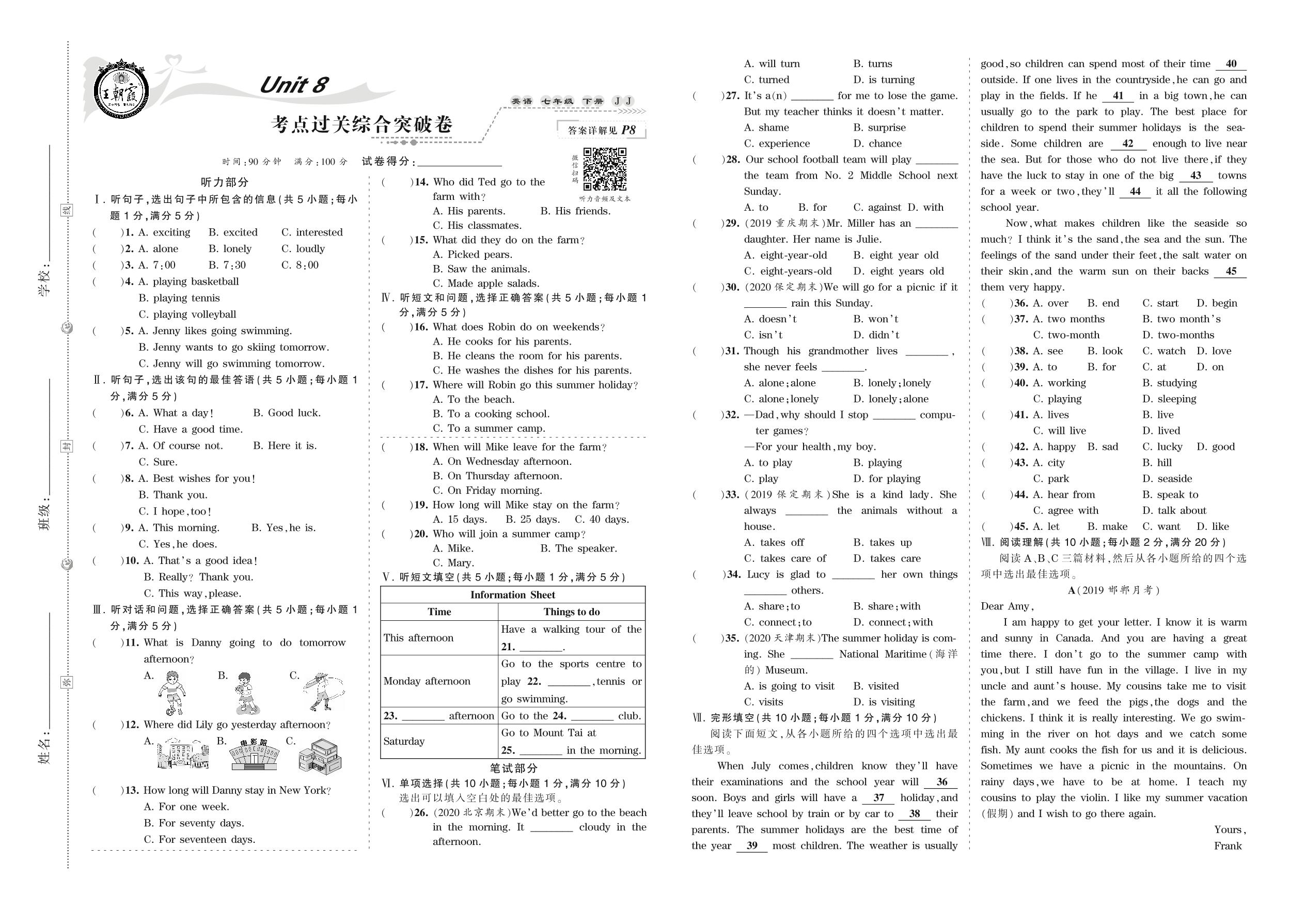 2021下册七年级英语冀教版 Unit 8 考点过关综合突破卷