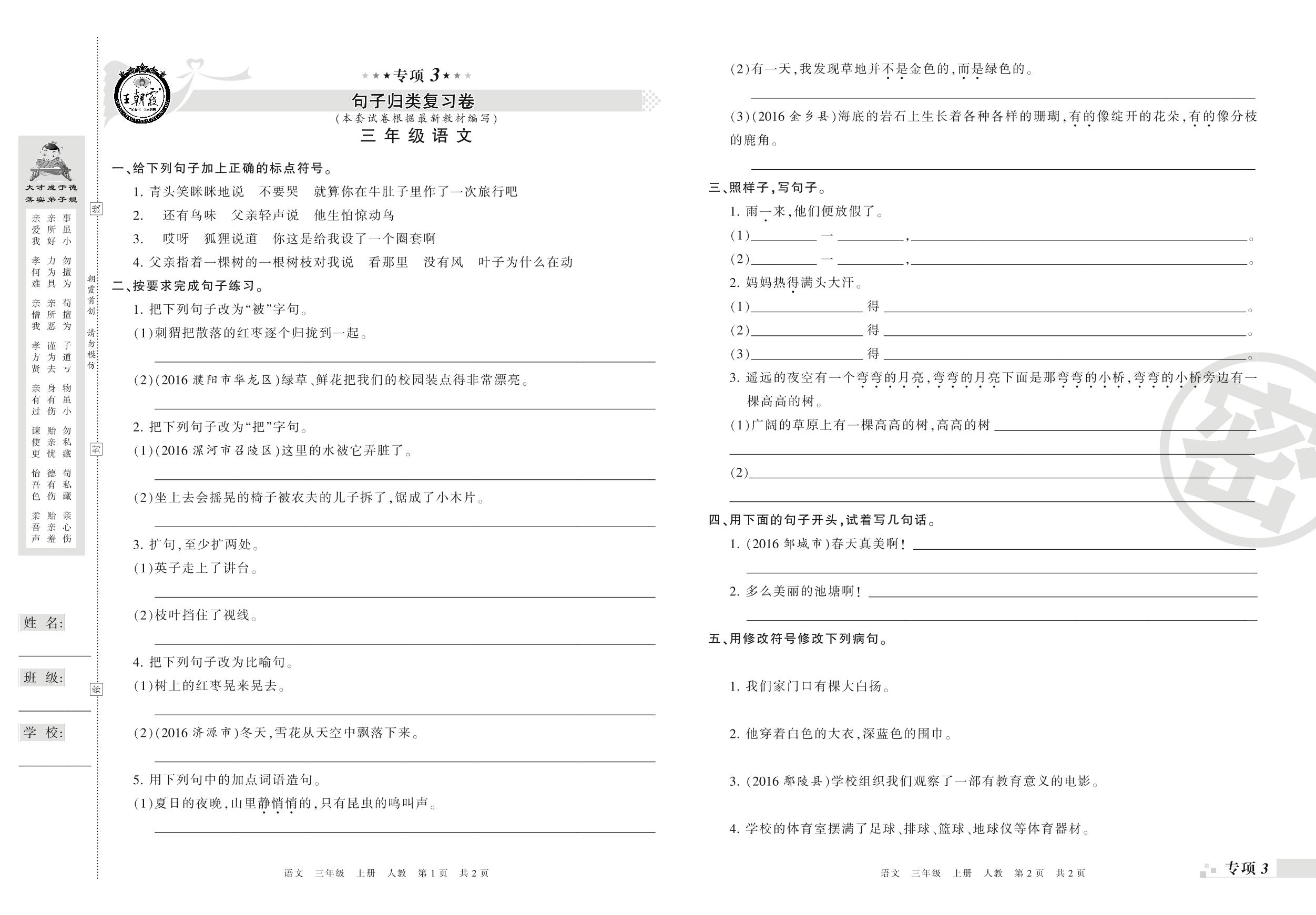 王朝霞期末专项卷——句子、课文内容真题归类复习三年级上册语文(人教版)_R210801102855【0】