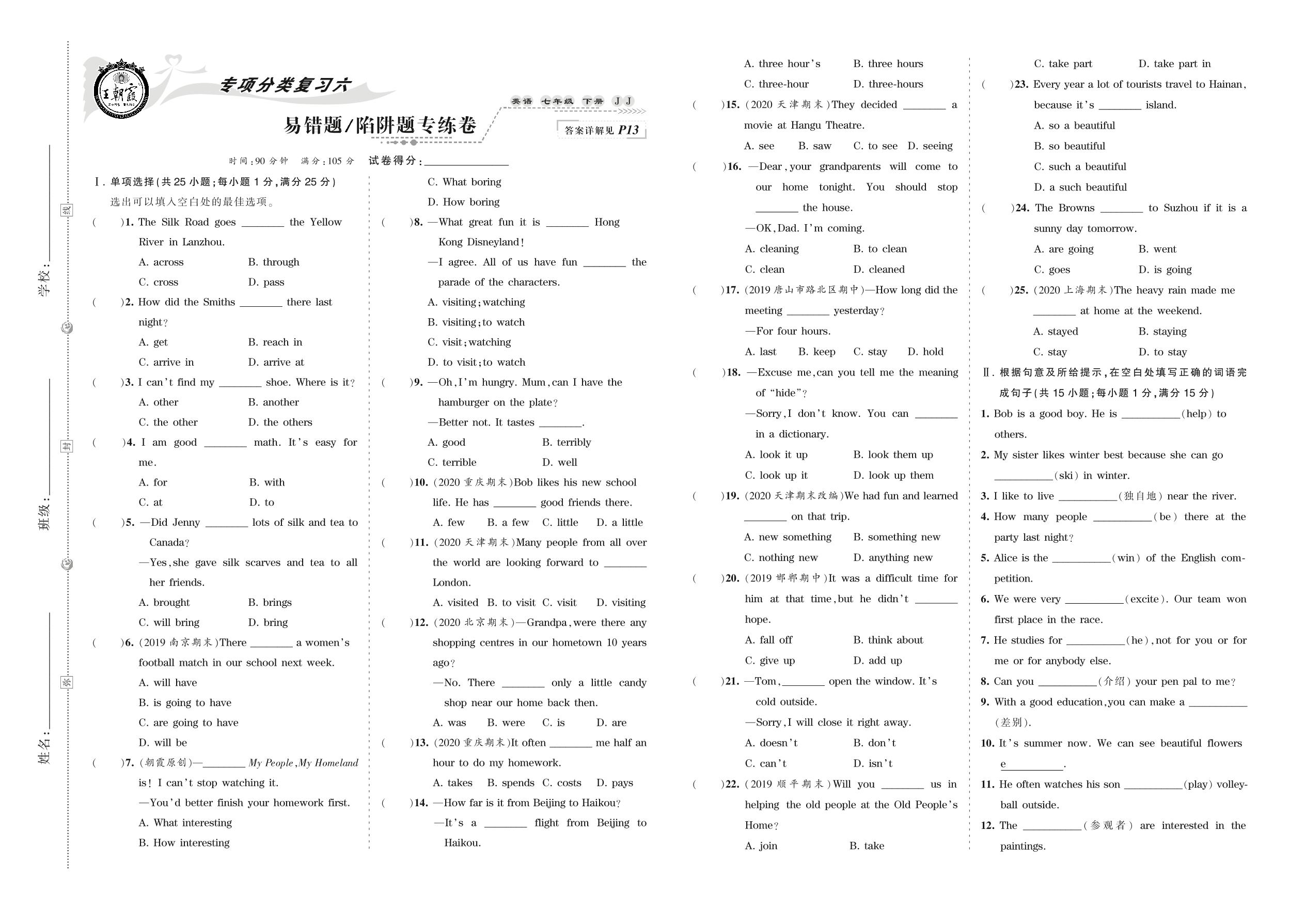 2021下册七年级英语冀教版 易错题陷阱题专练卷
