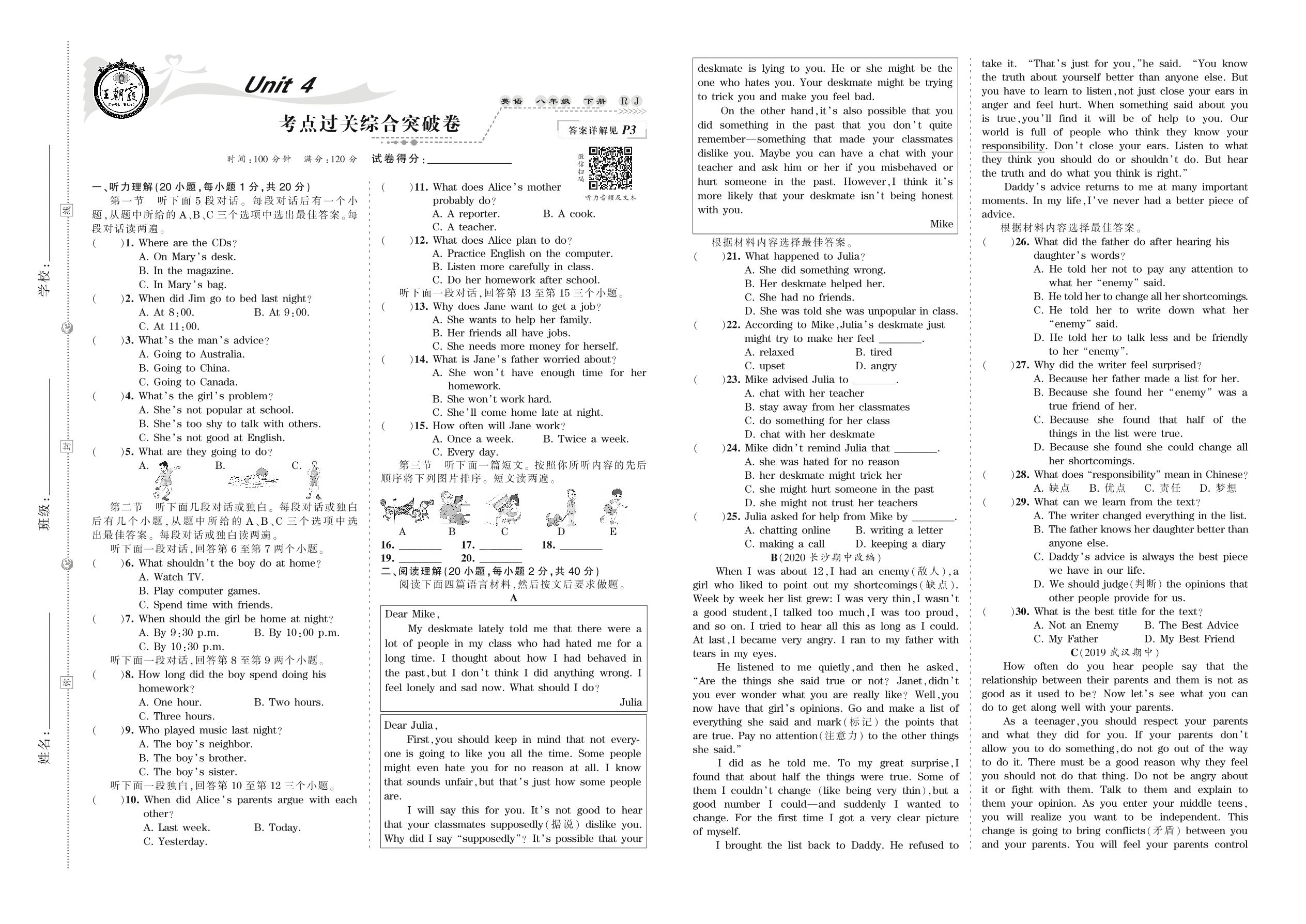 2021下册八年级英语人教版 Unit 4 考点过关综合突破卷