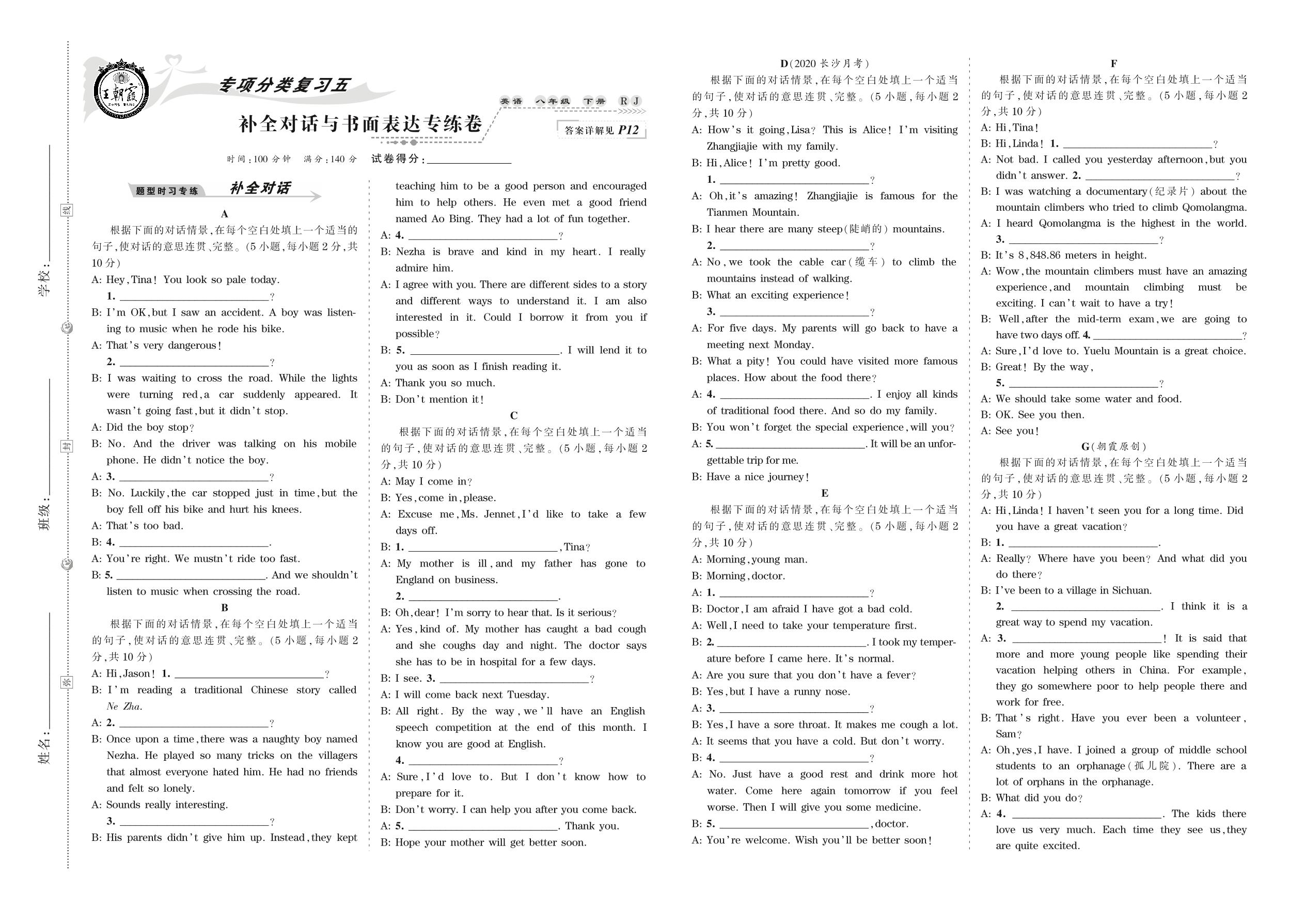 2021下册八年级英语人教版 补全对话与书面表达专练卷