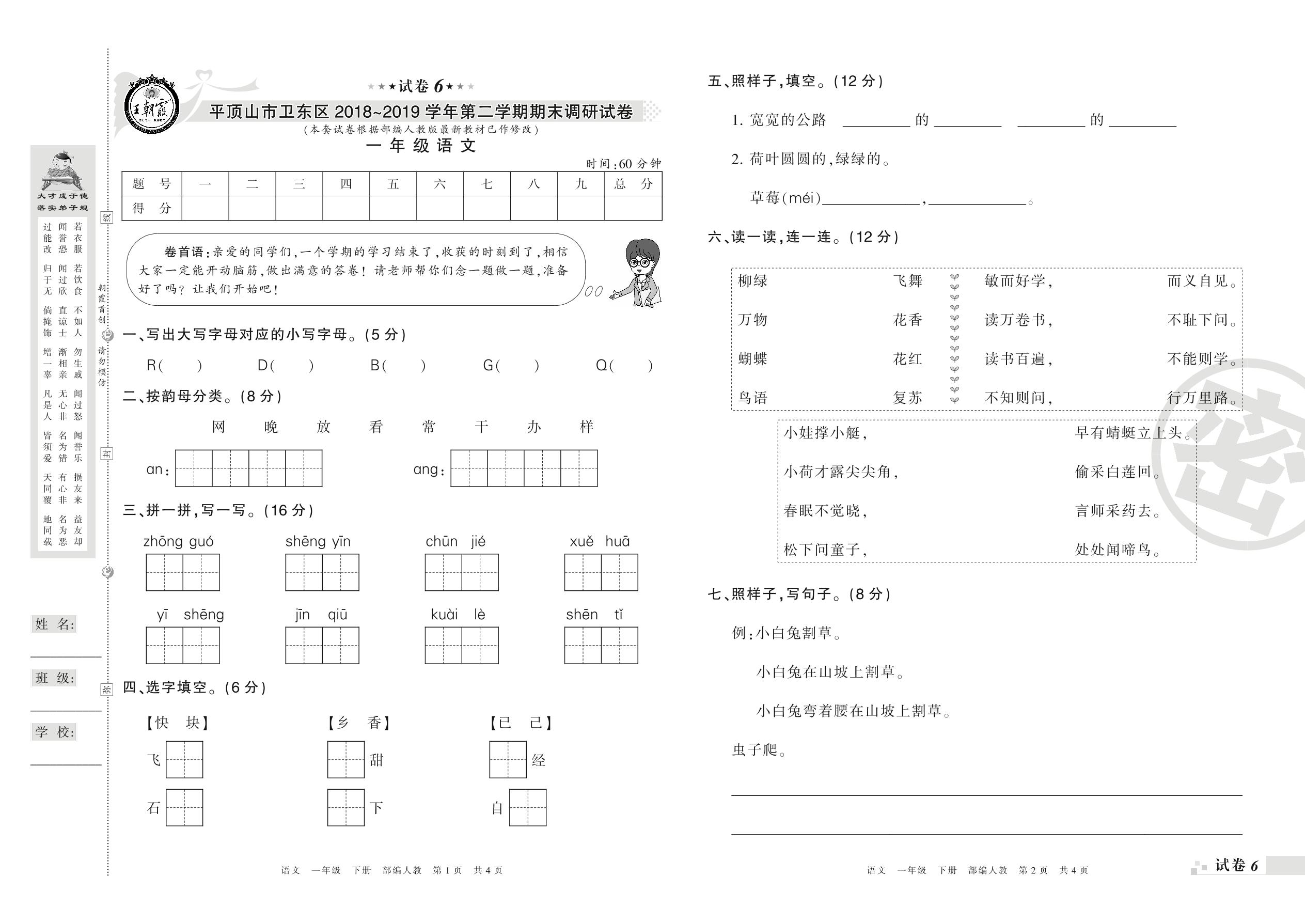 2018-2019学年第二学期平顶山市卫东区一年级语文试卷(人教版)【6】