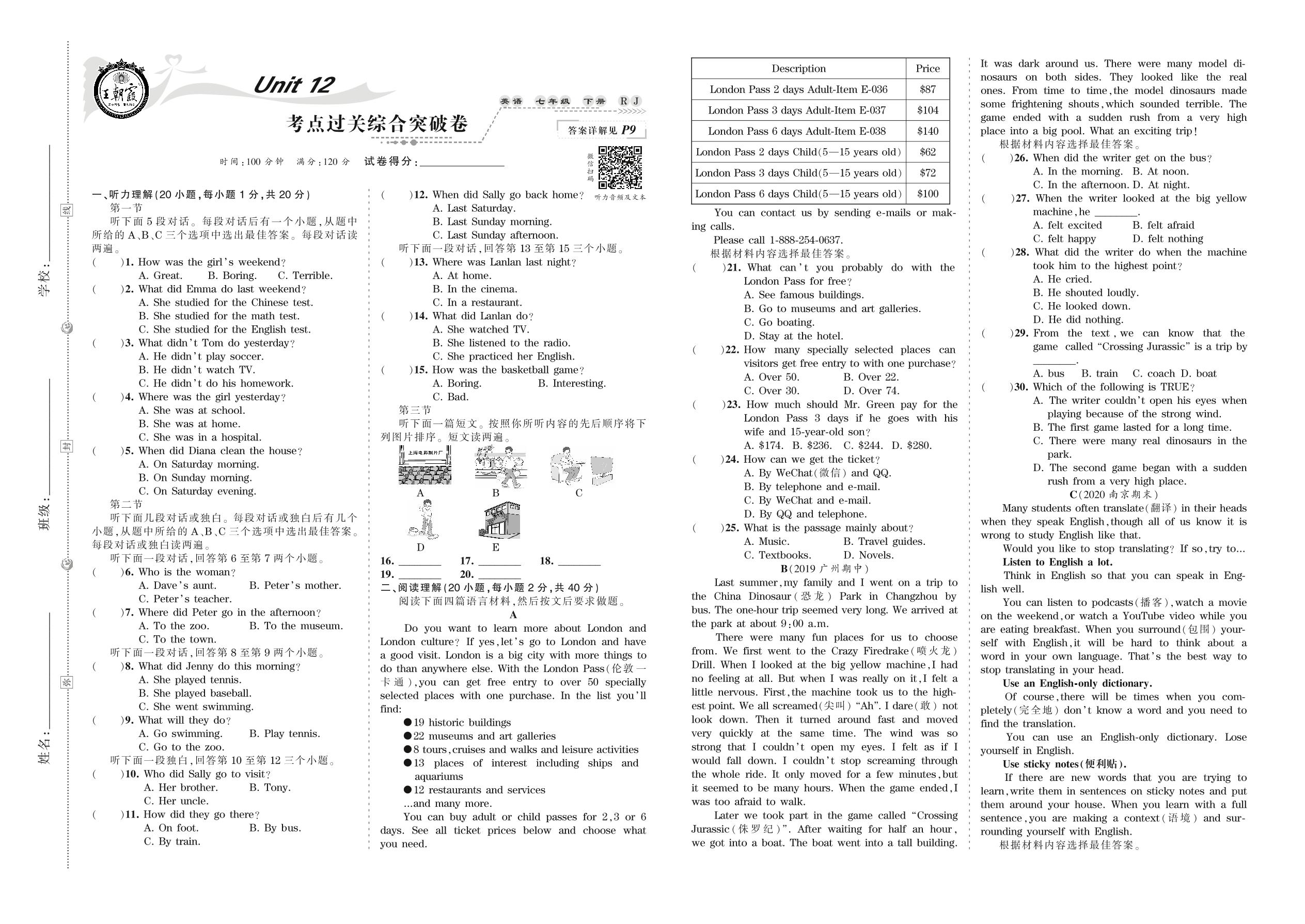 2021下册七年级英语人教版 Unit 12 考点过关综合突破卷