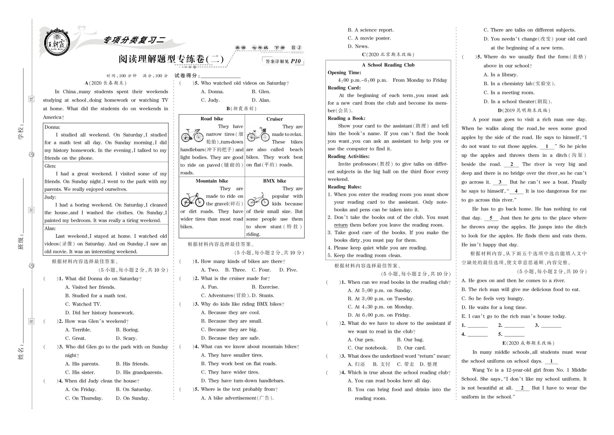 2021下册七年级英语人教版 阅读理解题型专练卷(二)