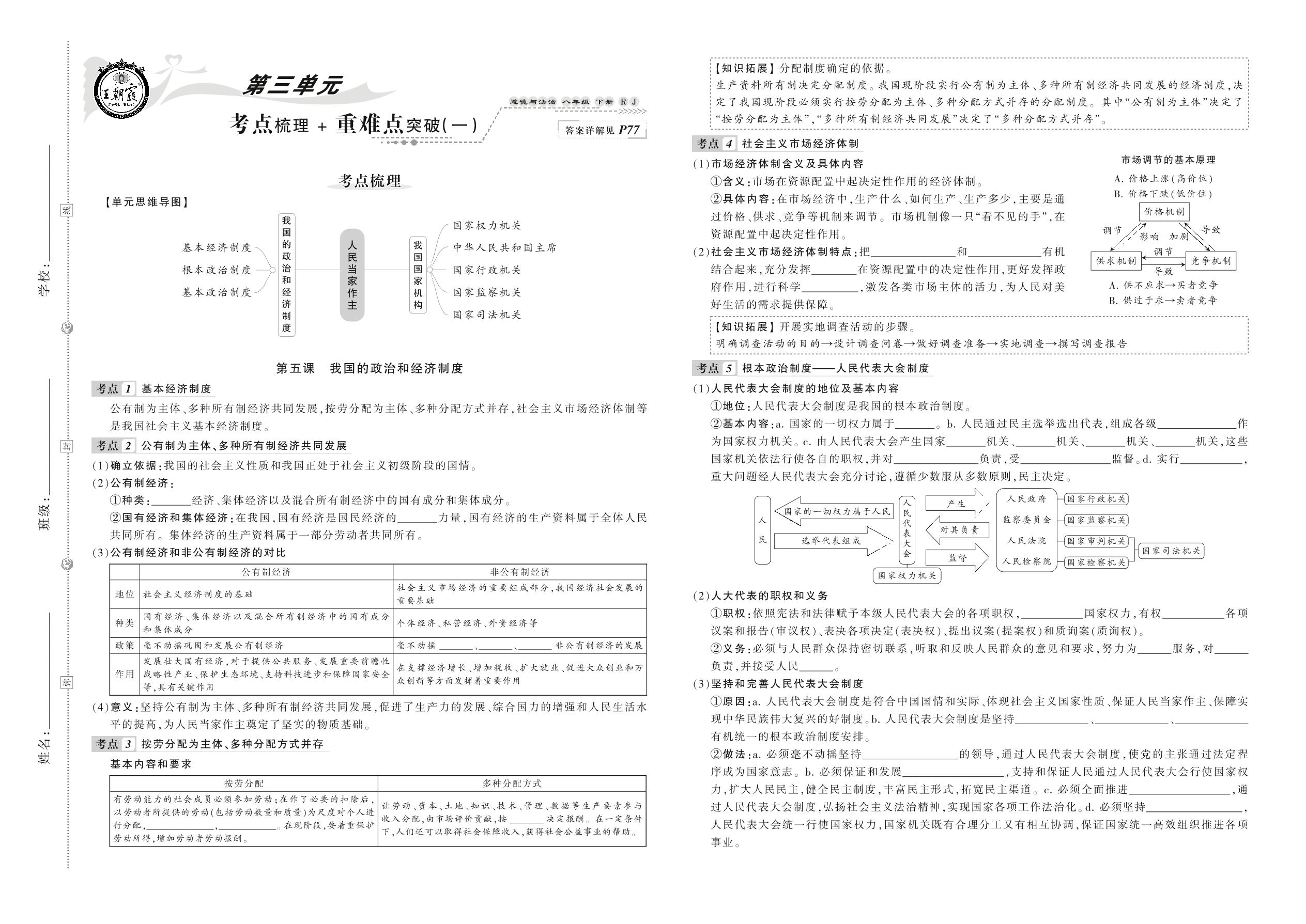 2021下册八年级道德与法治人教版 第三单元 考点梳理+重难点突破(一)