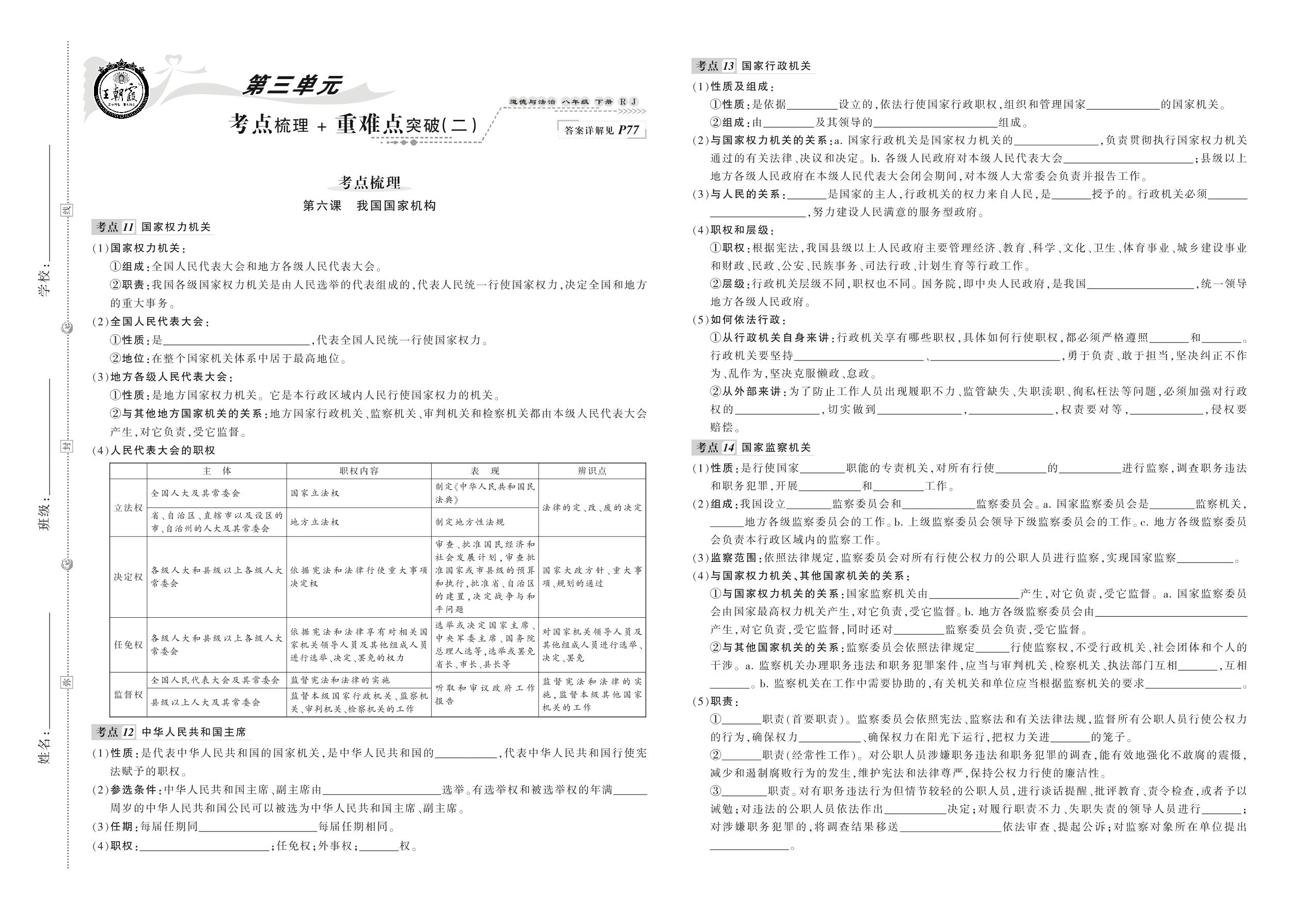 2021下册八年级道德与法治人教版 第三单元 考点梳理+重难点突破(二)