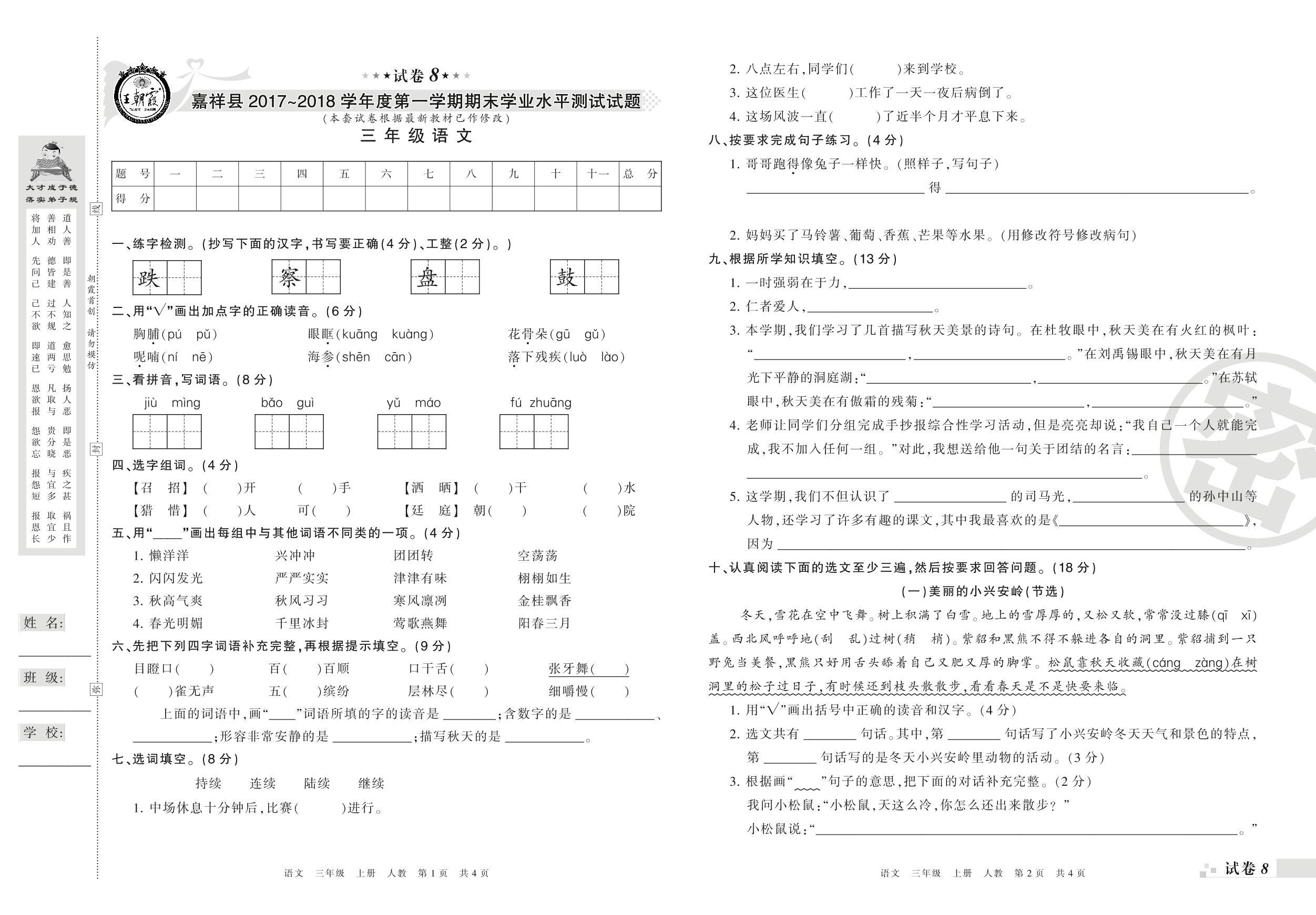 2017-2018学年第一学期济宁市嘉祥县三年级语文试卷(人教版)【8】
