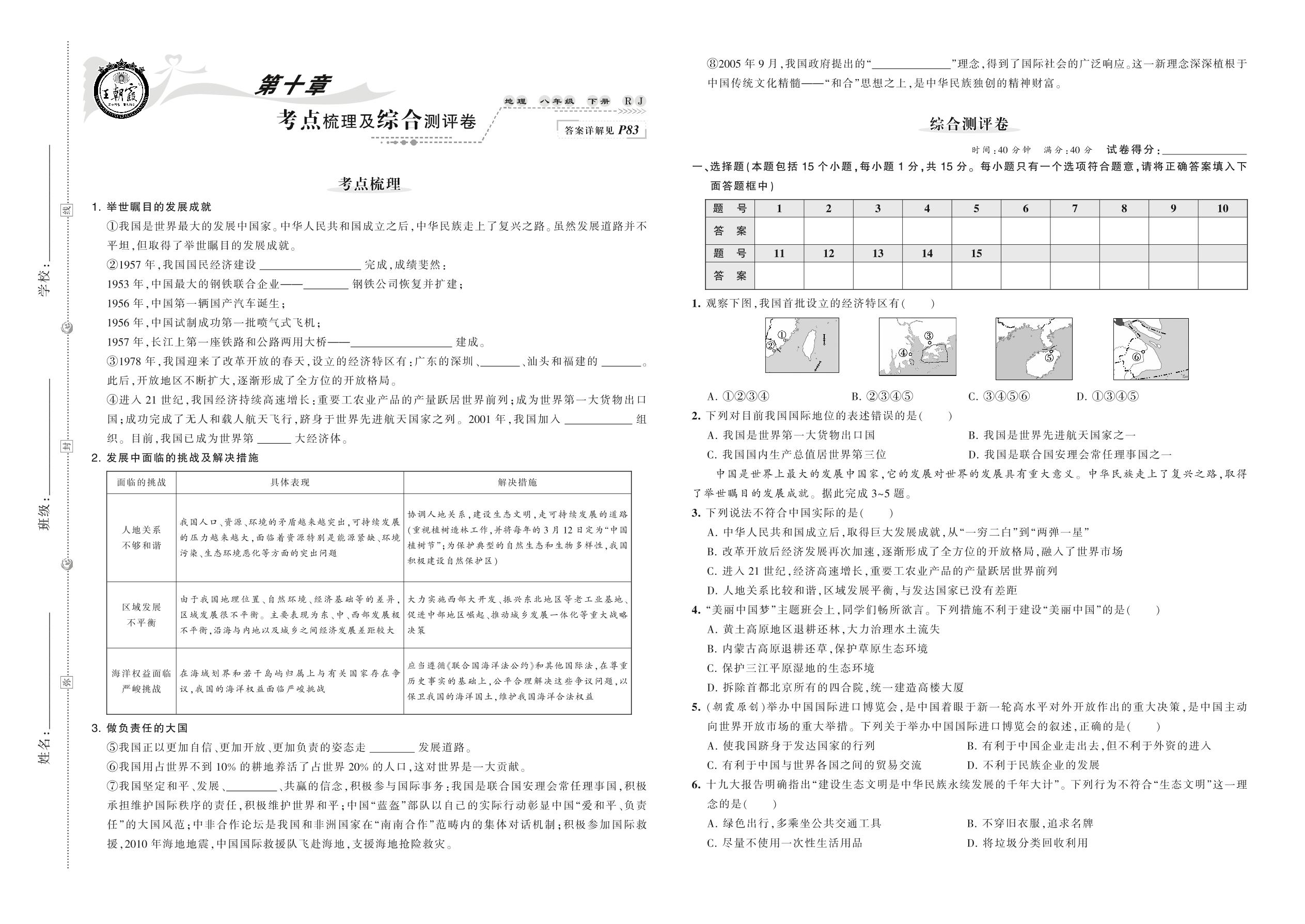 2021下册八年级地理人教版 第十章 考点梳理及综合测评卷