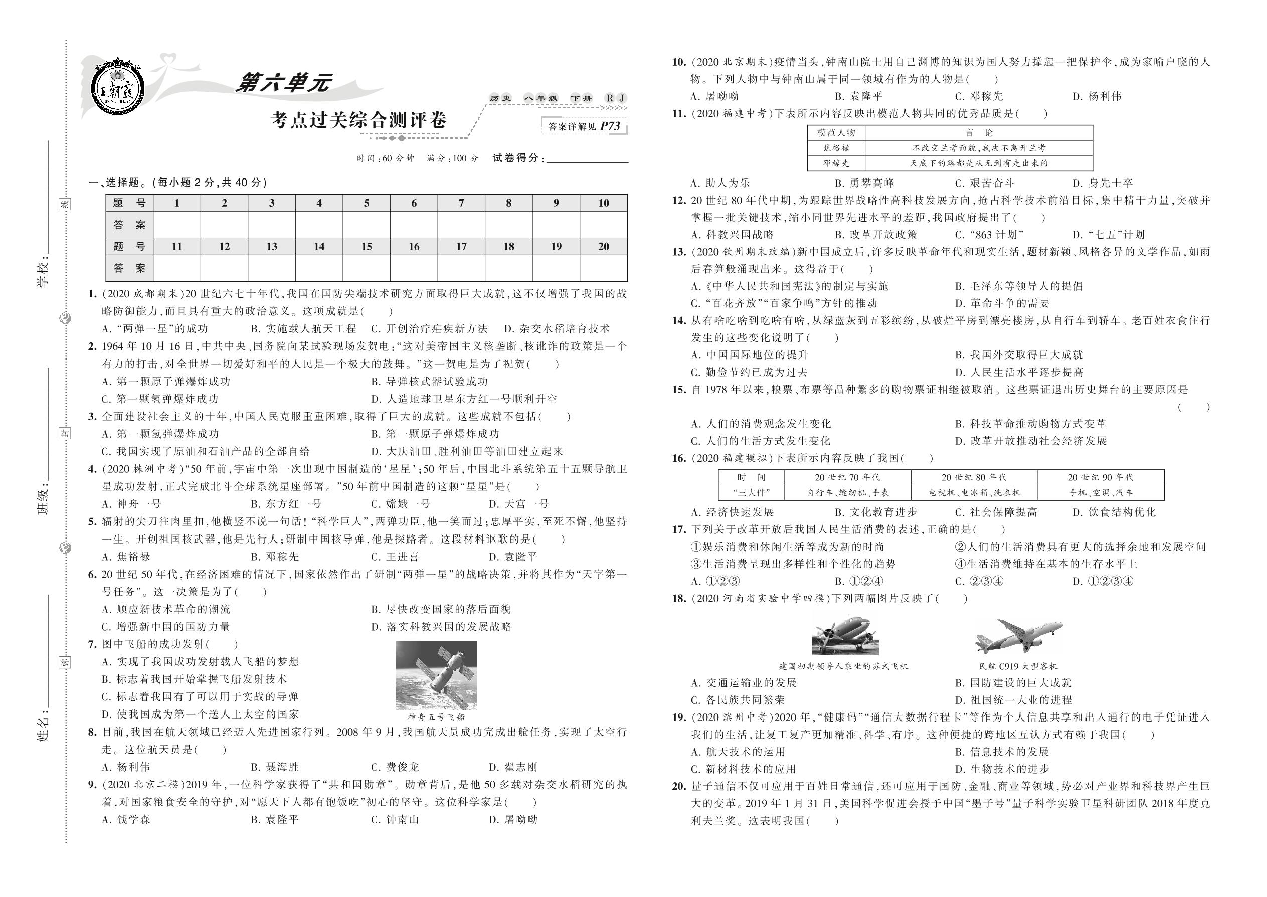 2021下册八年级历史人教版 第六单元 考点过关综合测评卷