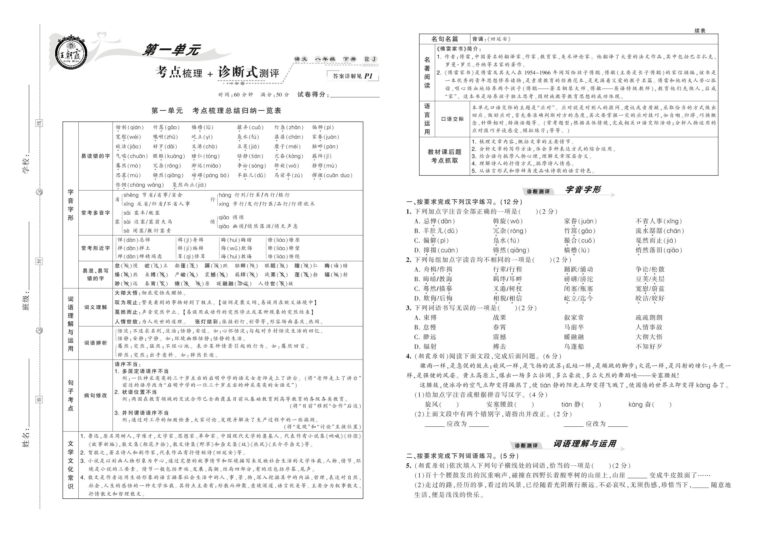 2021下册八年级语文人教版 第一单元 考点梳理+诊断式测评
