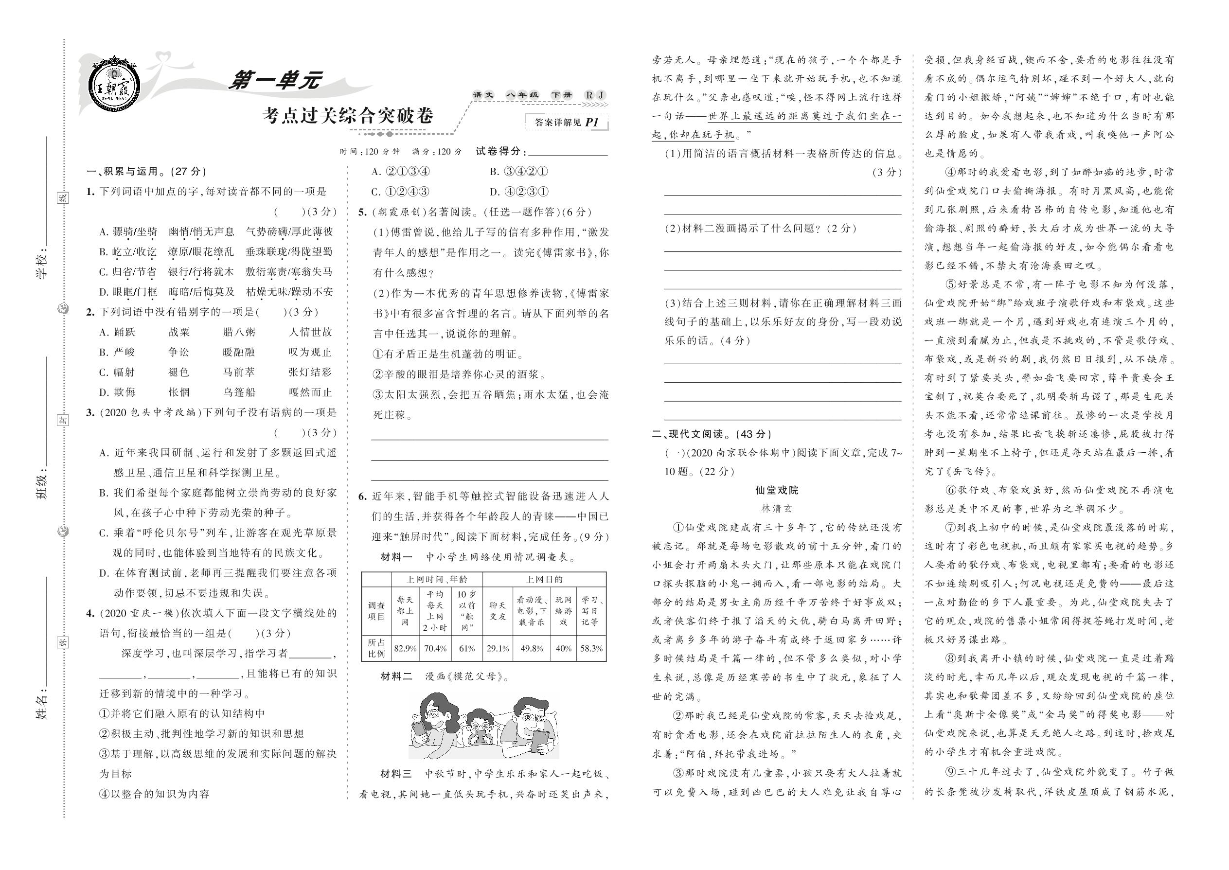 2021下册八年级语文人教版 第一单元 考点过关综合突破卷