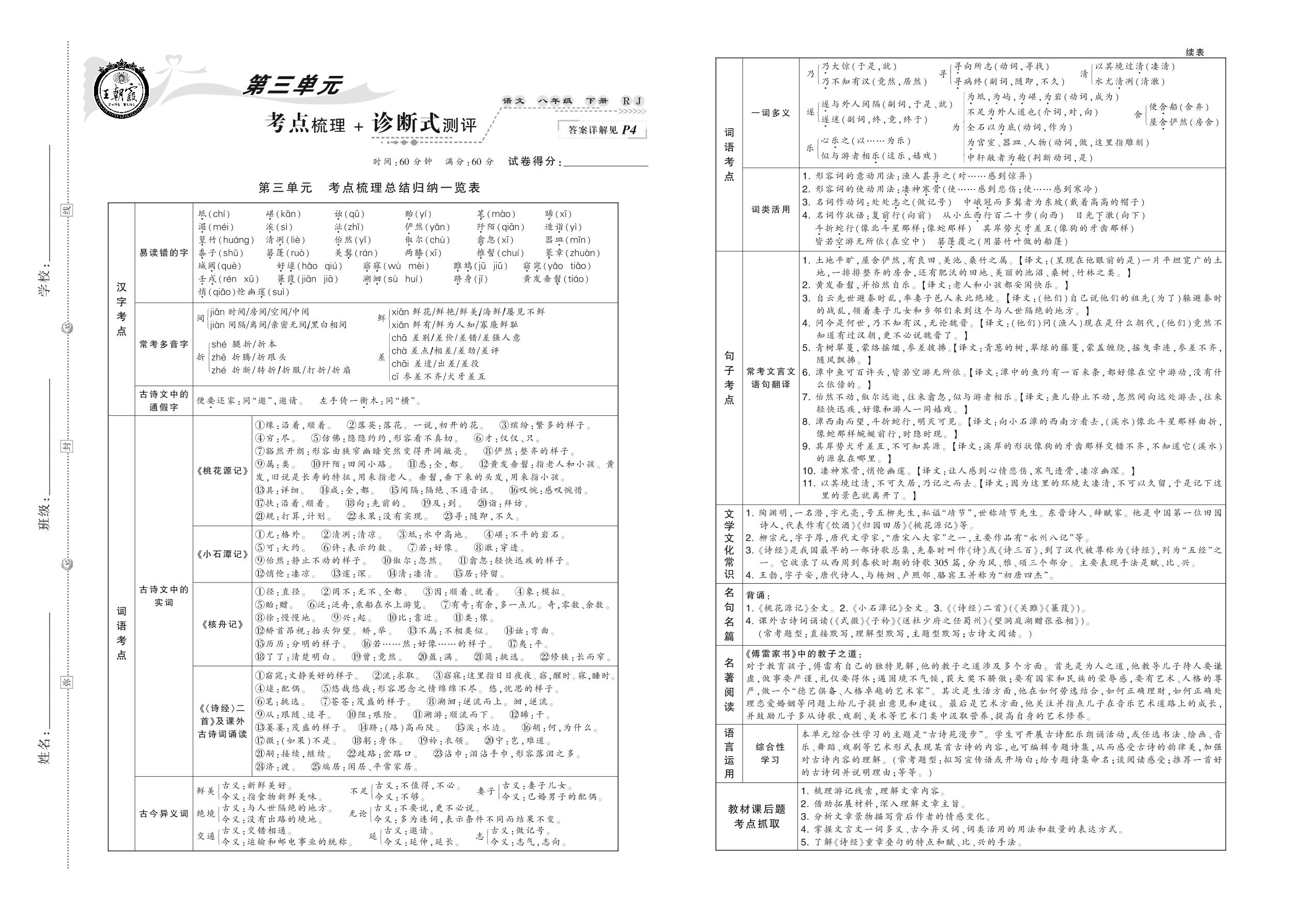 2021下册八年级语文人教版 第三单元 考点梳理+诊断式测评