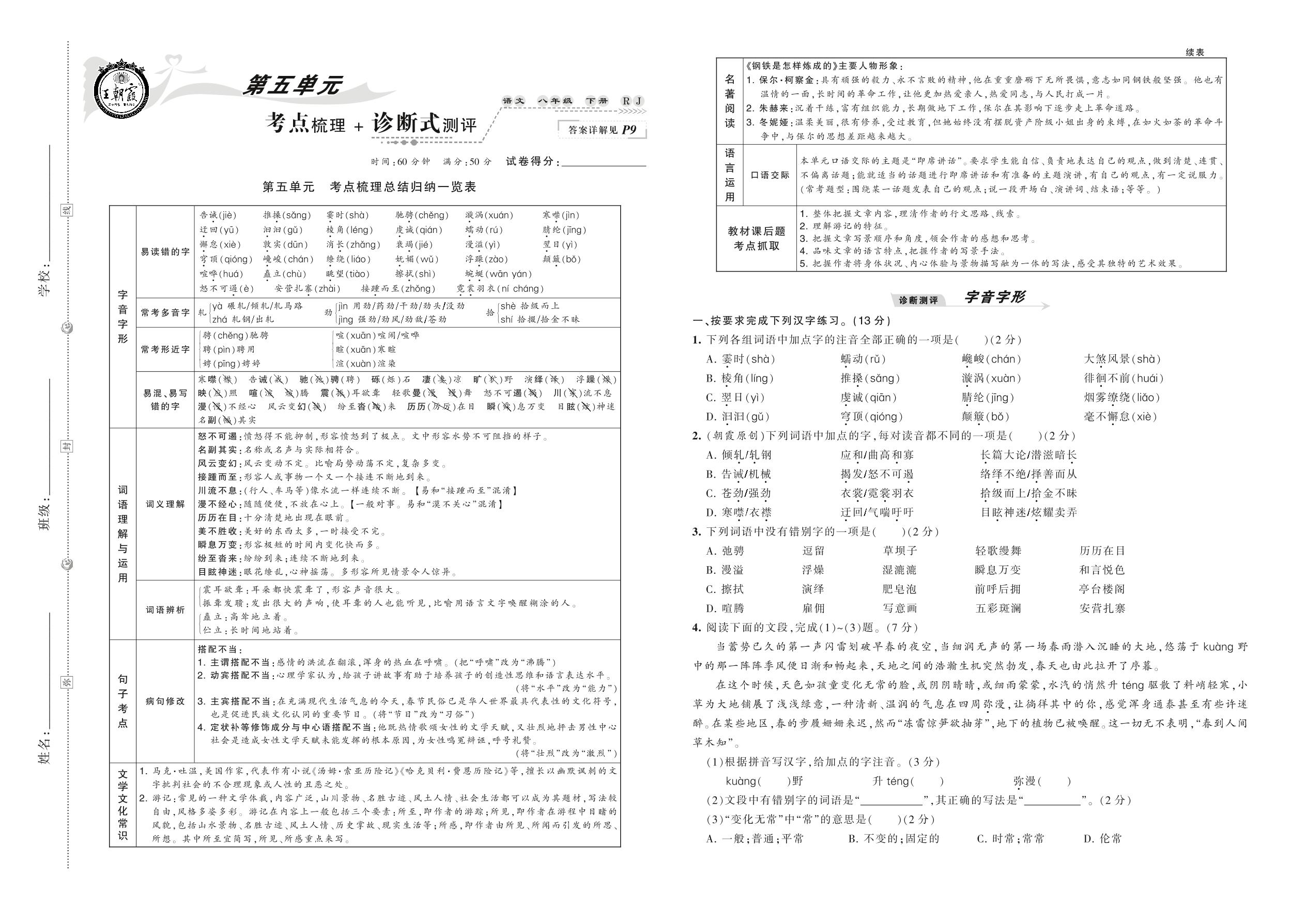 2021下册八年级语文人教版 第五单元 考点梳理+诊断式测评