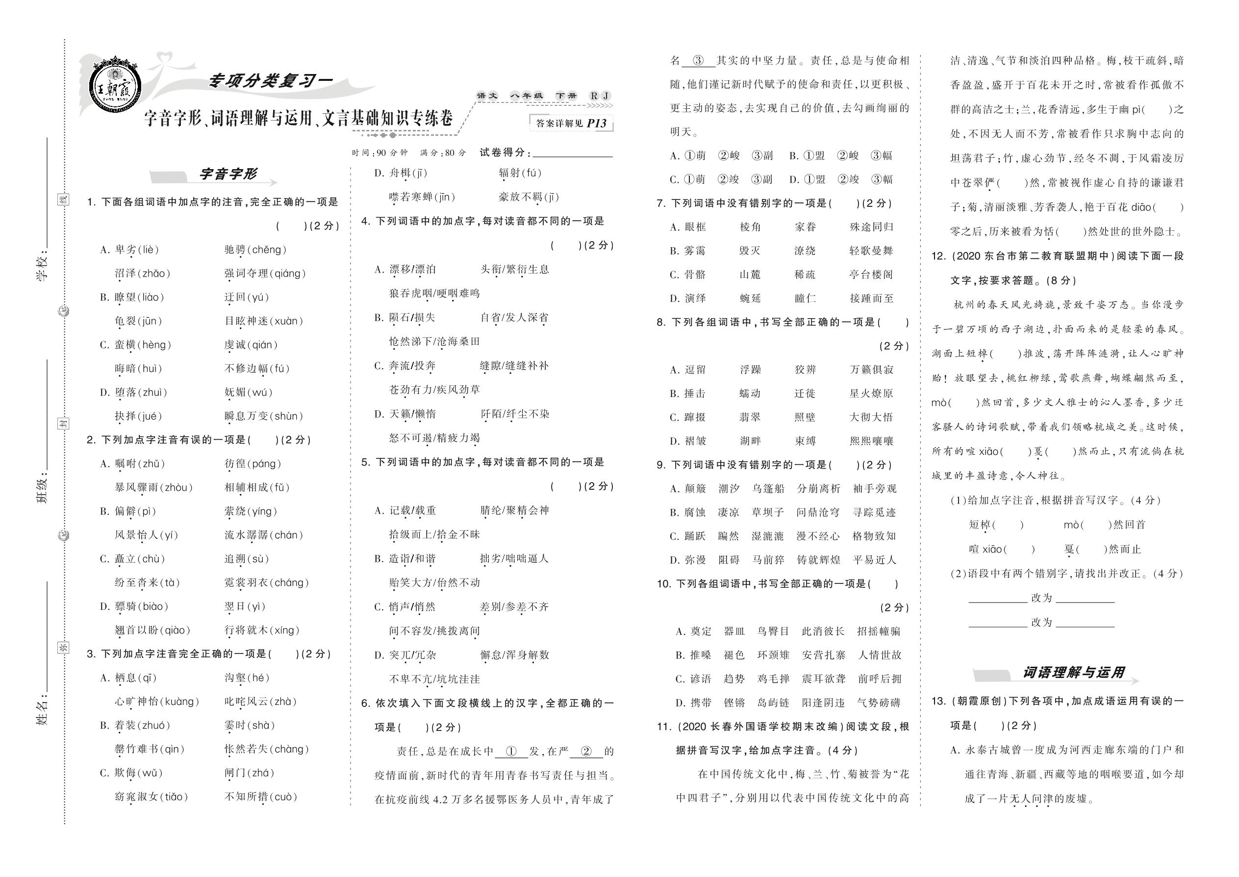 2021下册八年级语文人教版 字音字形、词语理解与运用、文言基础知识专练卷
