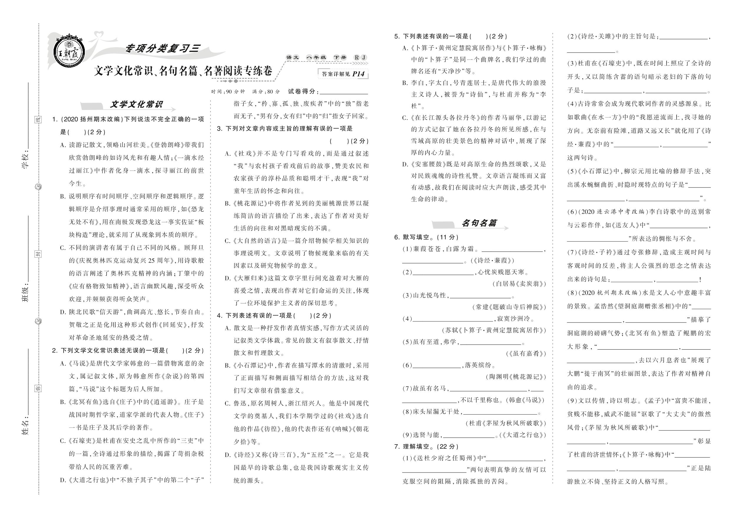 2021下册八年级语文人教版 文学文化常识、名句名篇、名著阅读专练卷