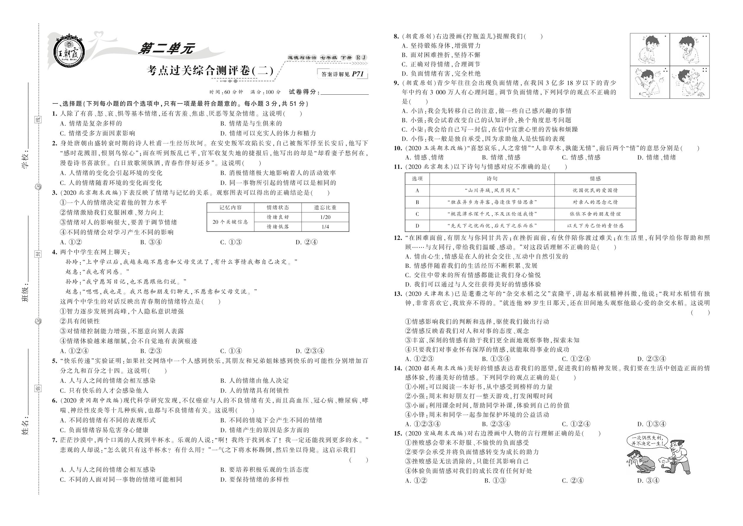 2021下册七年级道德与法治人教版 第二单元 考点过关综合测评卷(二)