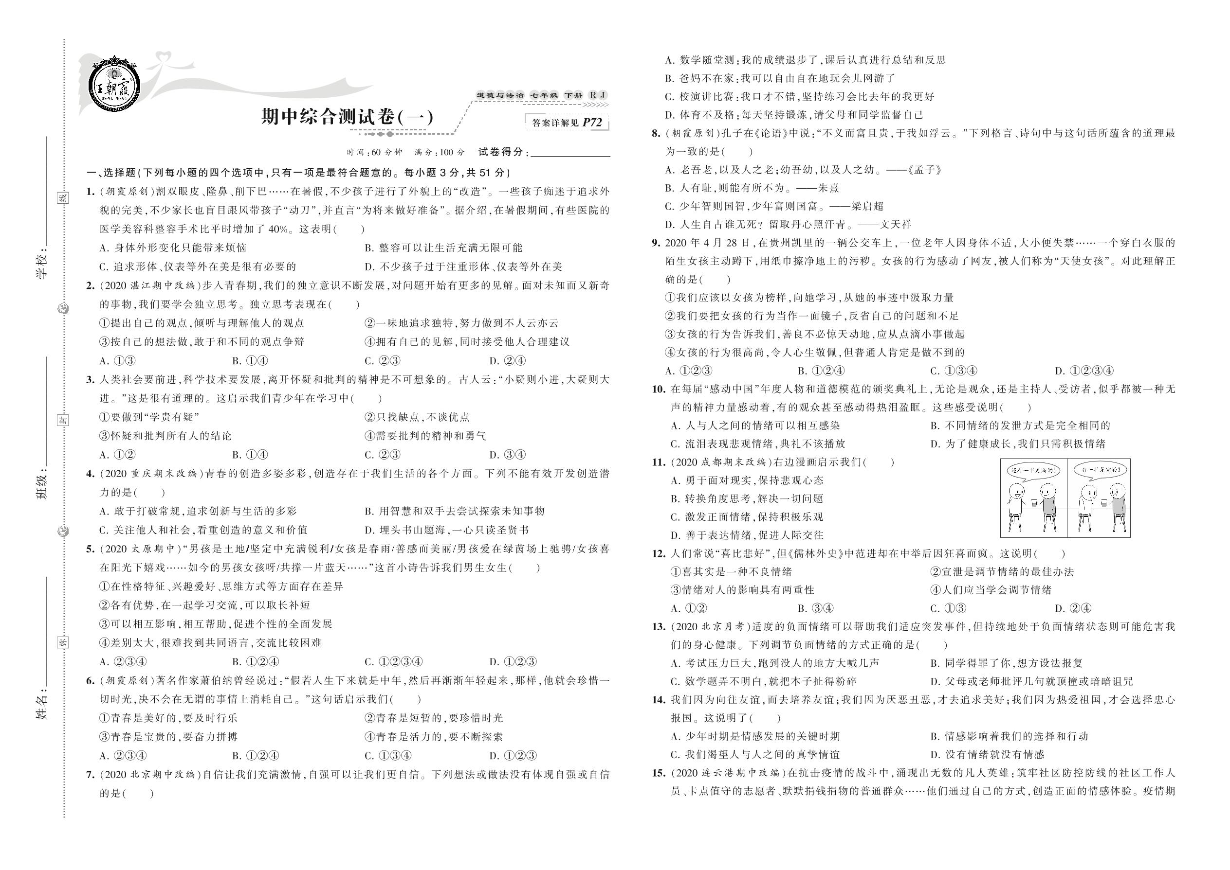 2021下册七年级道德与法治人教版 期中综合测试卷(一)