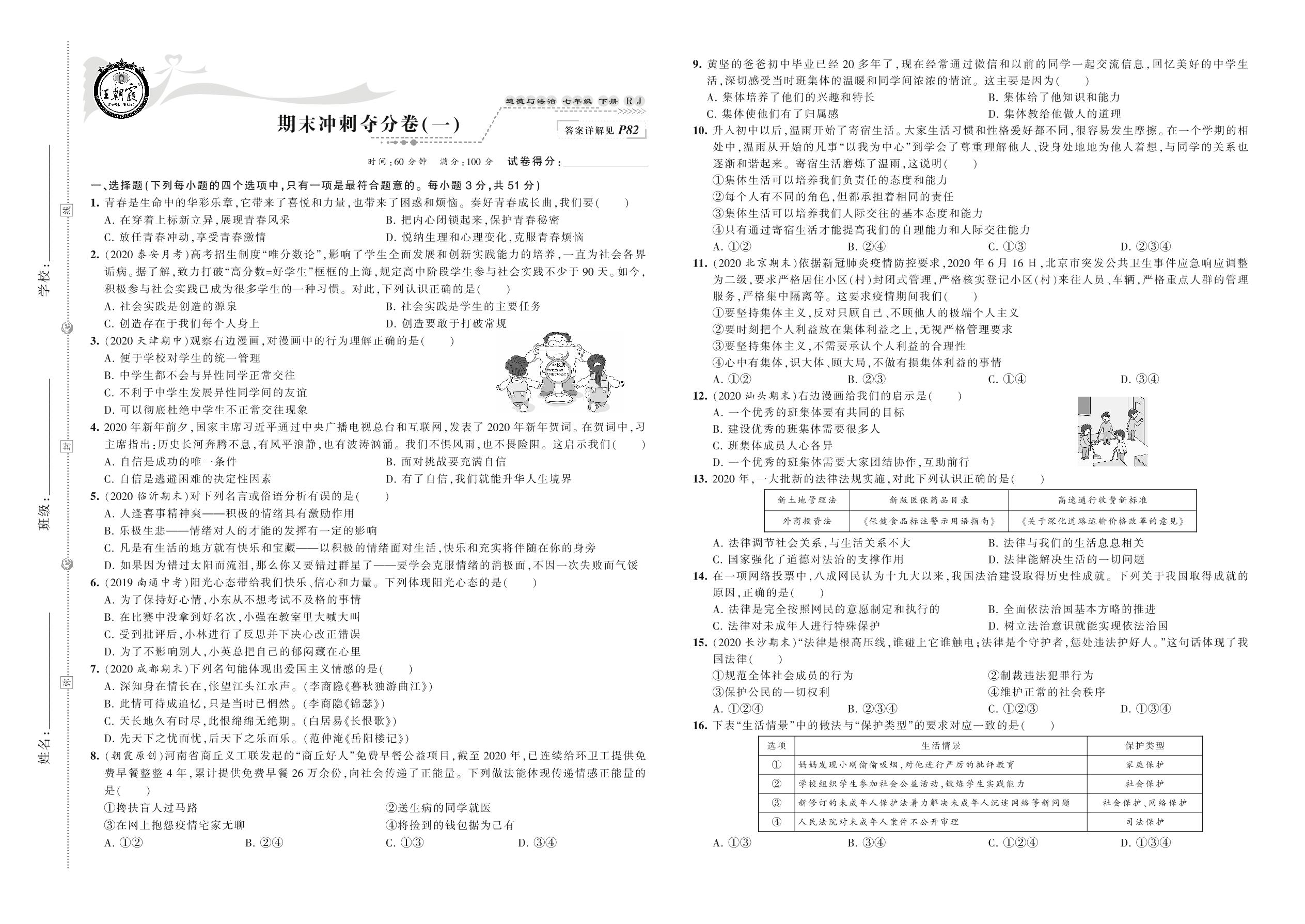 2021下册七年级道德与法治人教版 期末冲刺夺分卷(一)