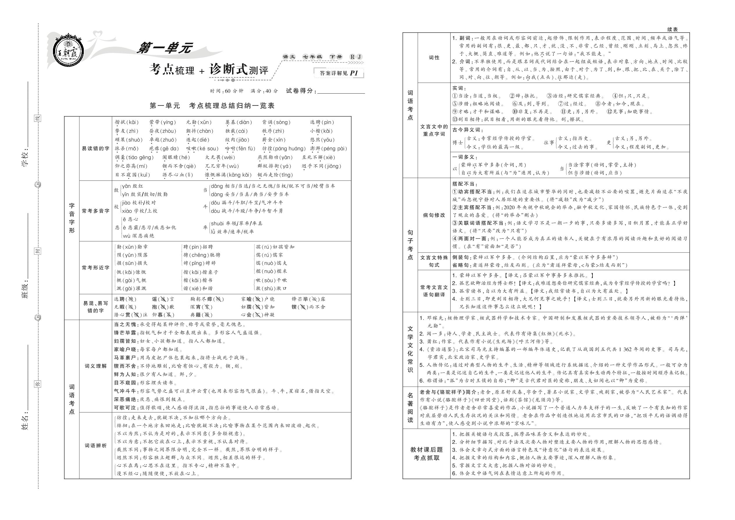 2021下册七年级语文人教版 第一单元 考点梳理+诊断式测评