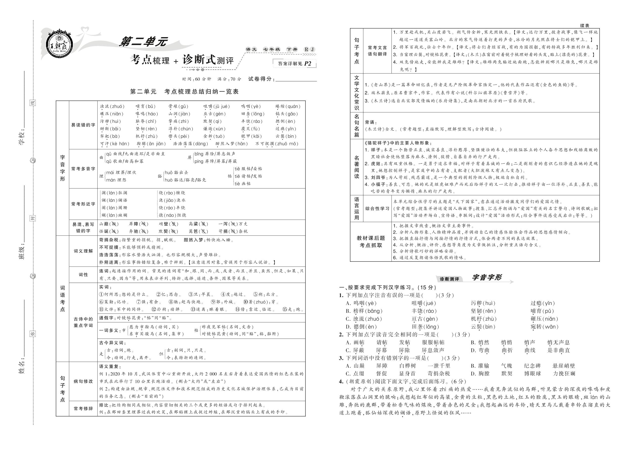 2021下册七年级语文人教版 第二单元 考点梳理+诊断式测评