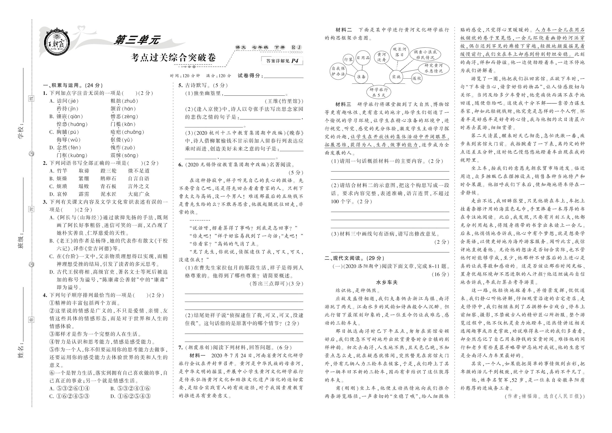 2021下册七年级语文人教版 第三单元 考点过关综合突破卷