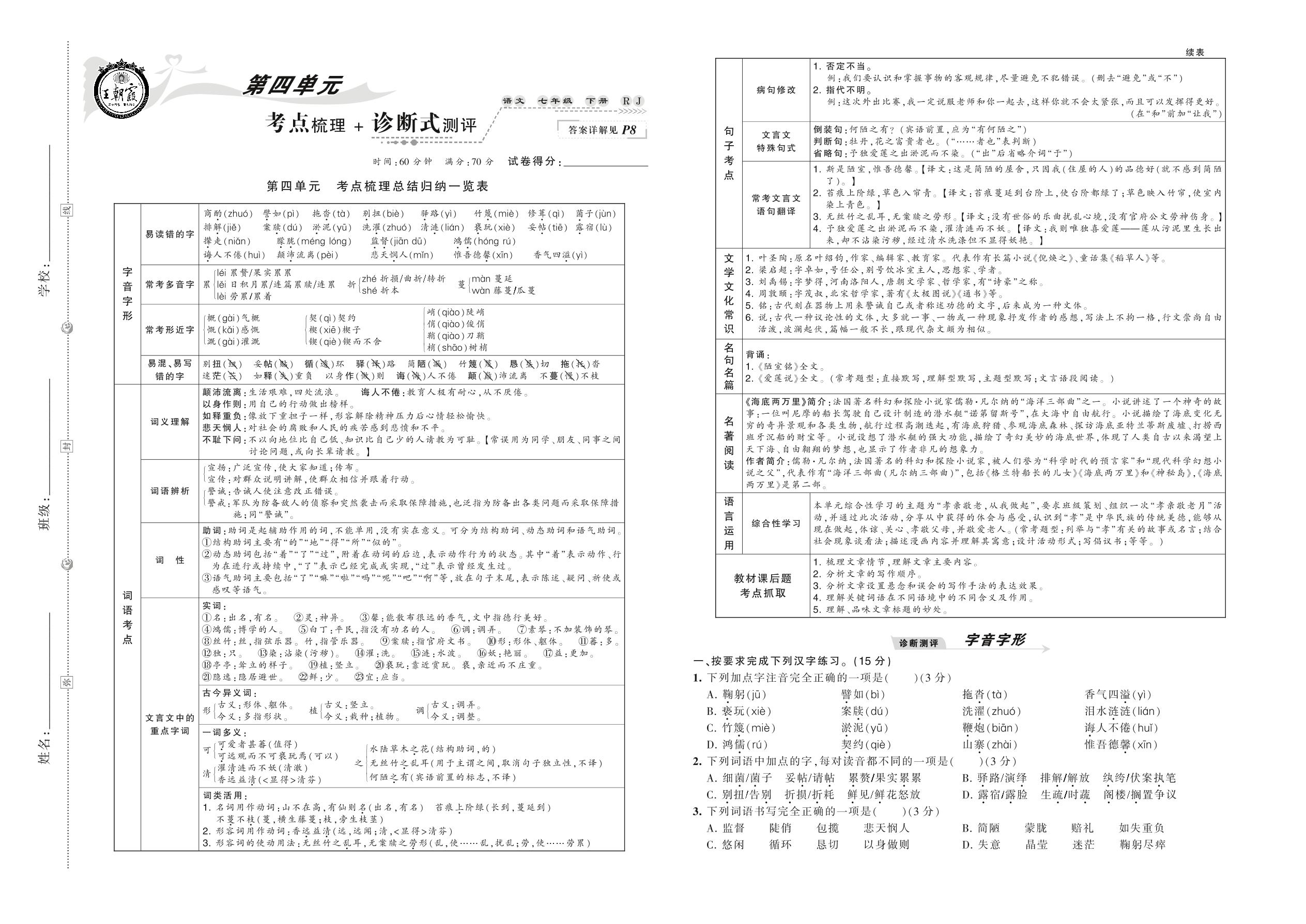 2021下册七年级语文人教版 第四单元 考点梳理+诊断式测评