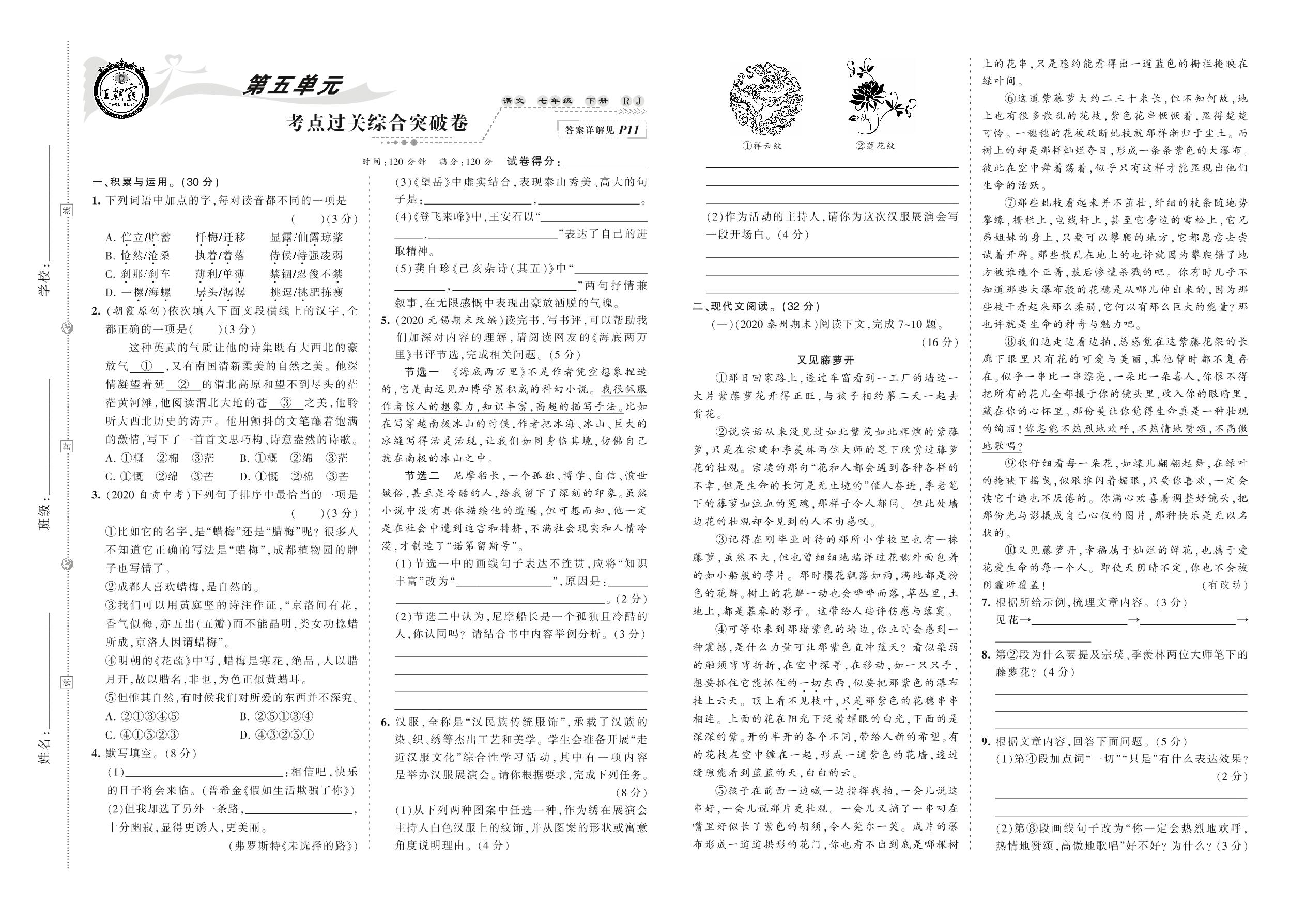 2021下册七年级语文人教版 第五单元 考点过关综合突破卷