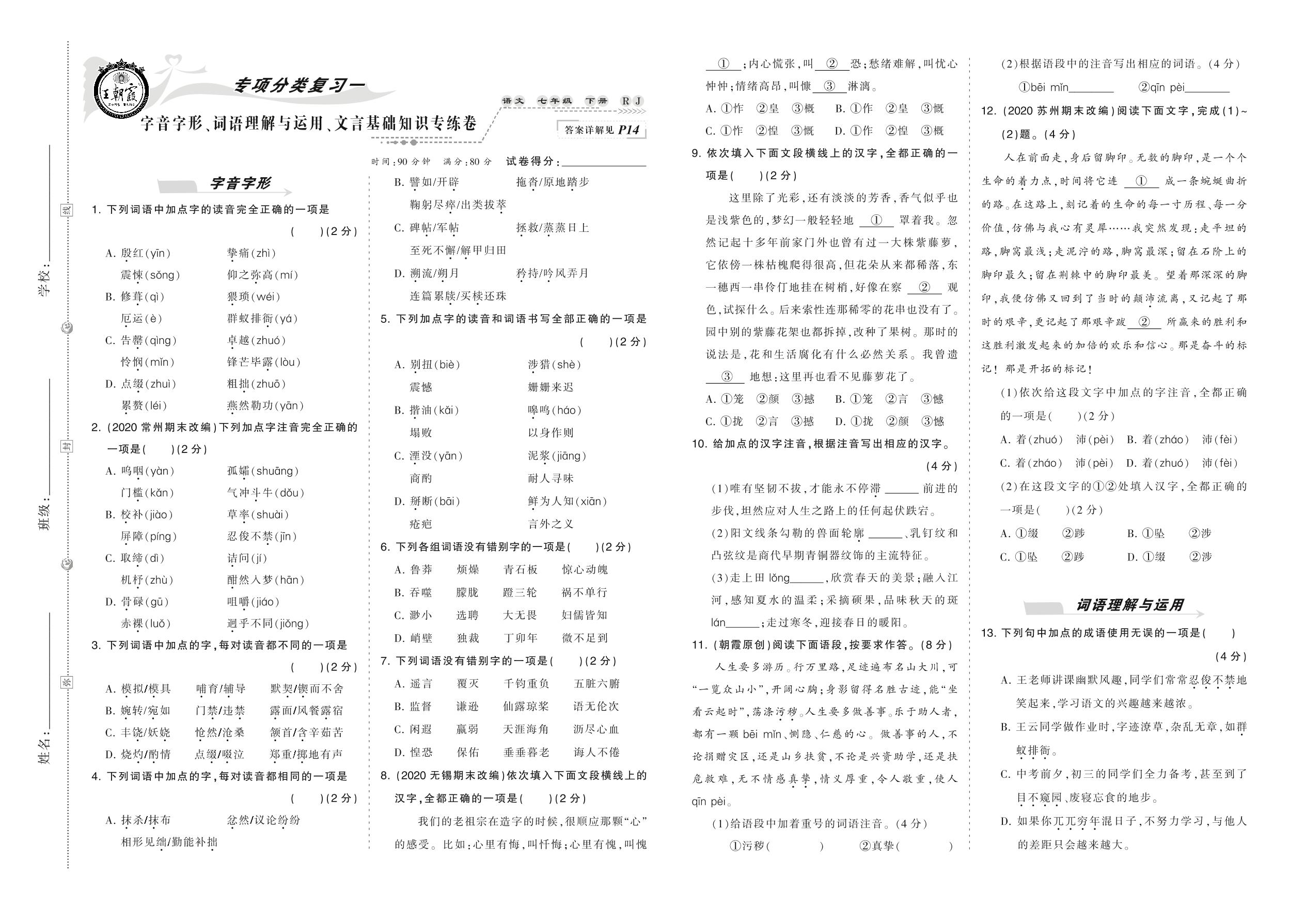 2021下册七年级语文人教版 字音字形、词语理解与运用、文言基础知识专练卷