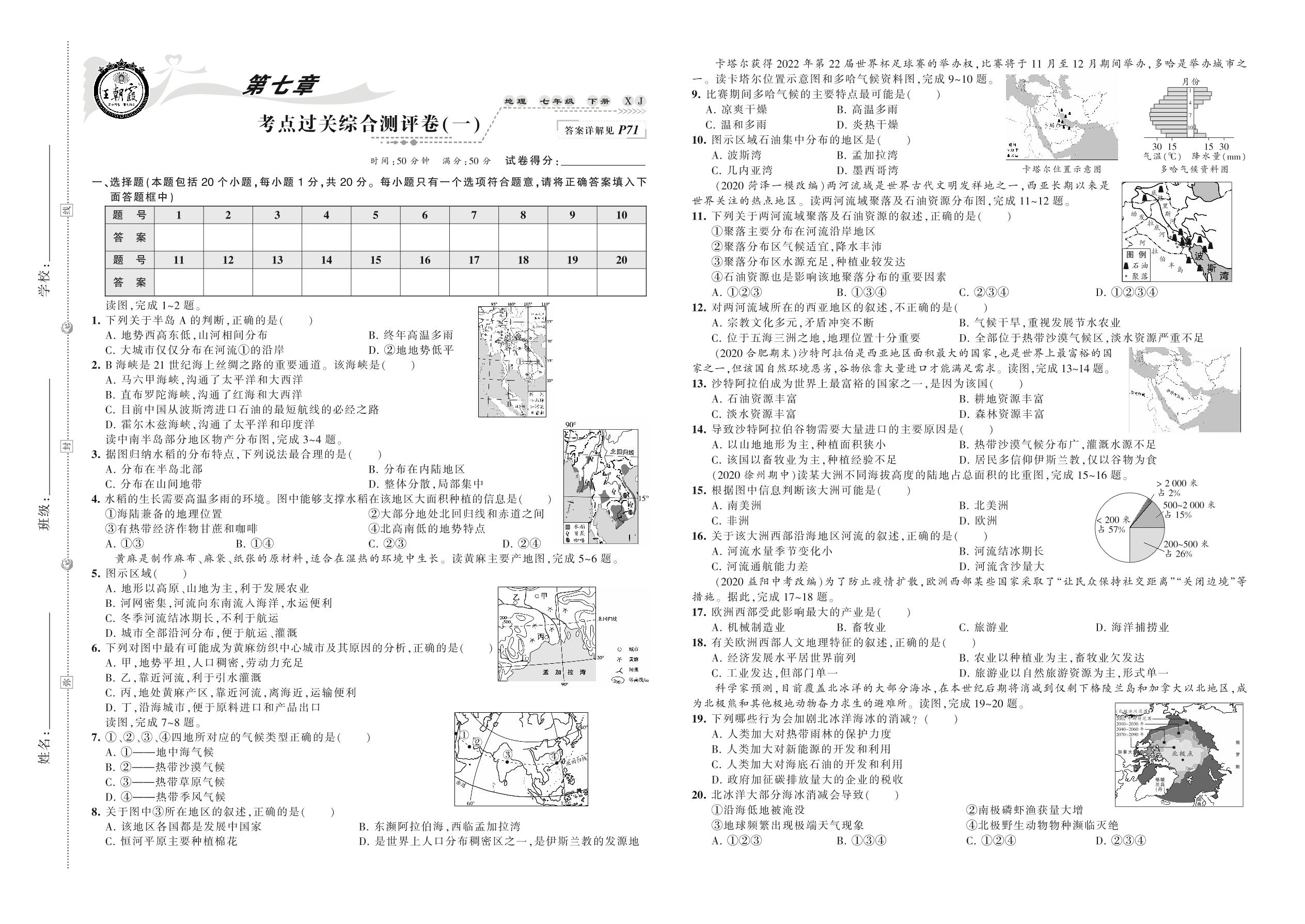 2021下册七年级地理湘教版 第七章 考点过关综合测评卷(一)