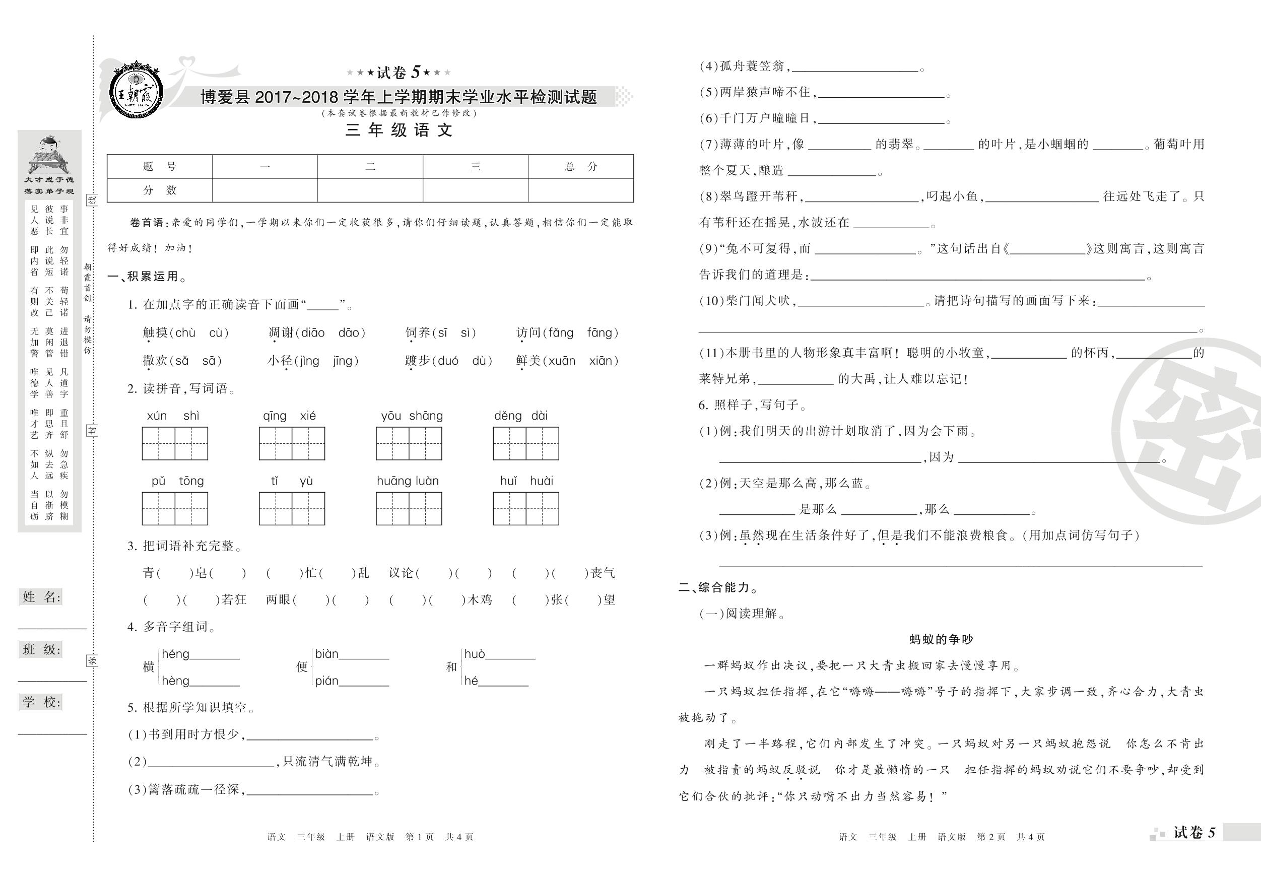 2017-2018学年第一学期焦作市博爱县三年级语文试卷(语文版)【5】