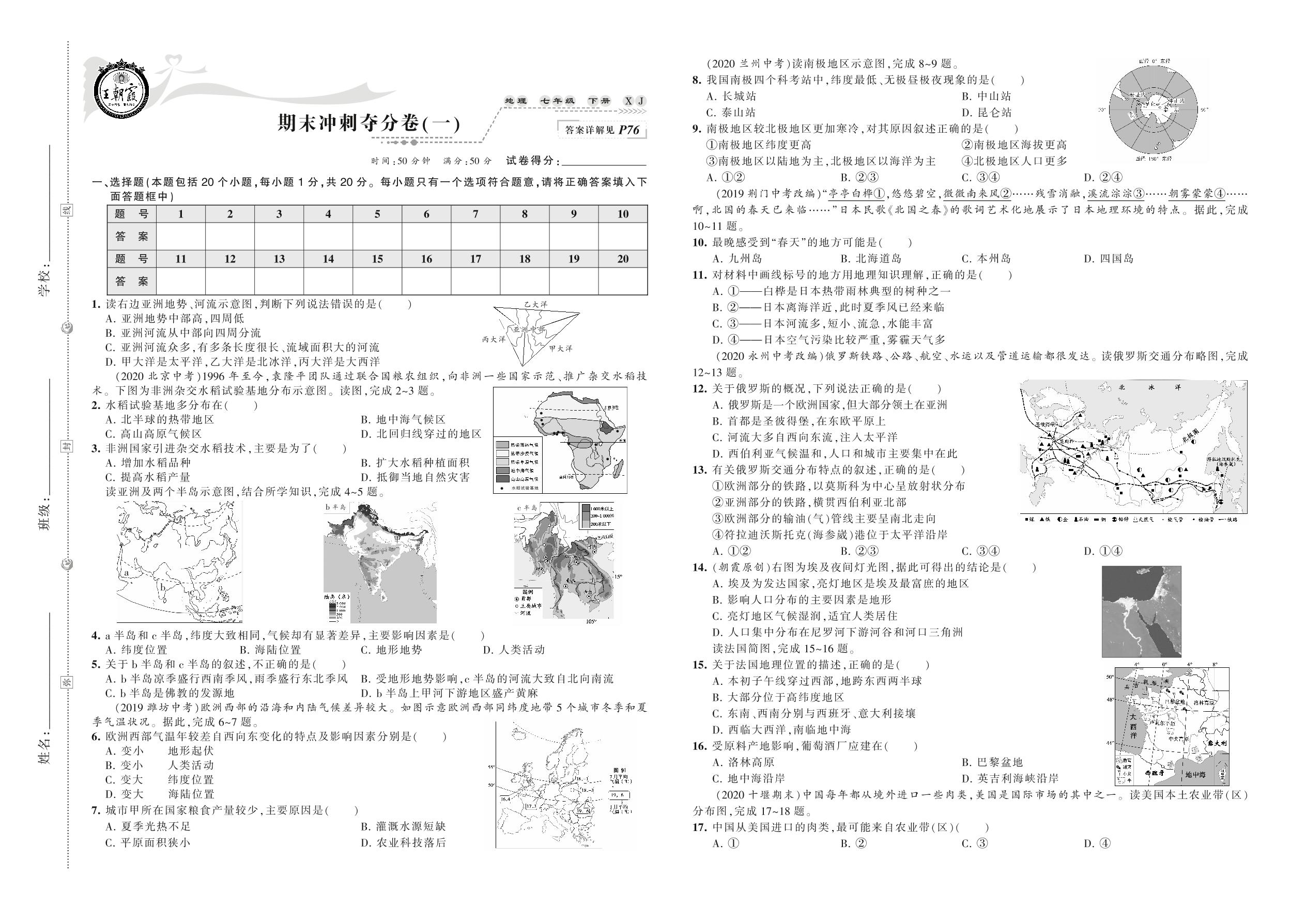 2021下册七年级地理湘教版 期末冲刺夺分卷(一)