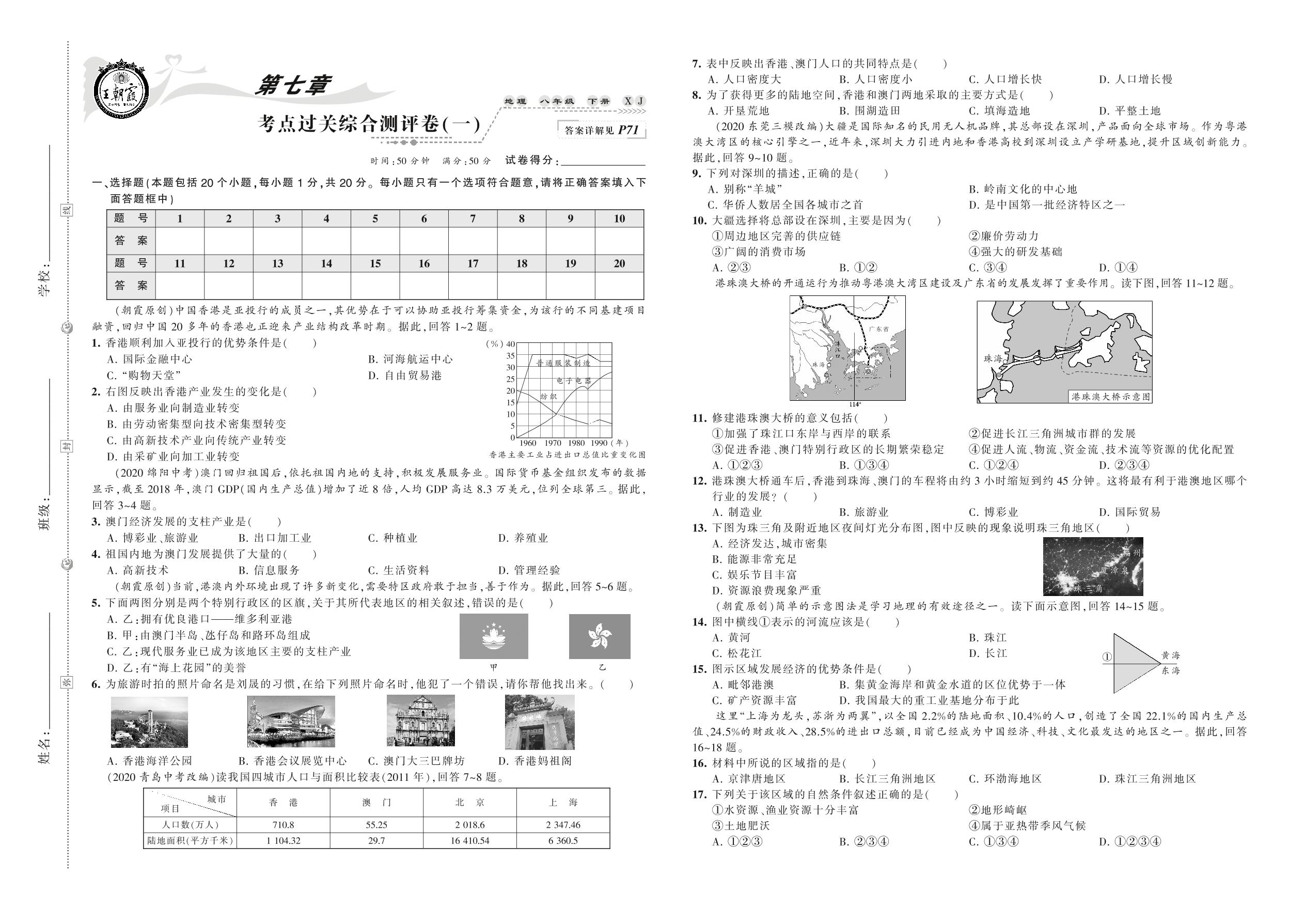2021下册八年级地理湘教版 第七章 考点过关综合测评卷(一)