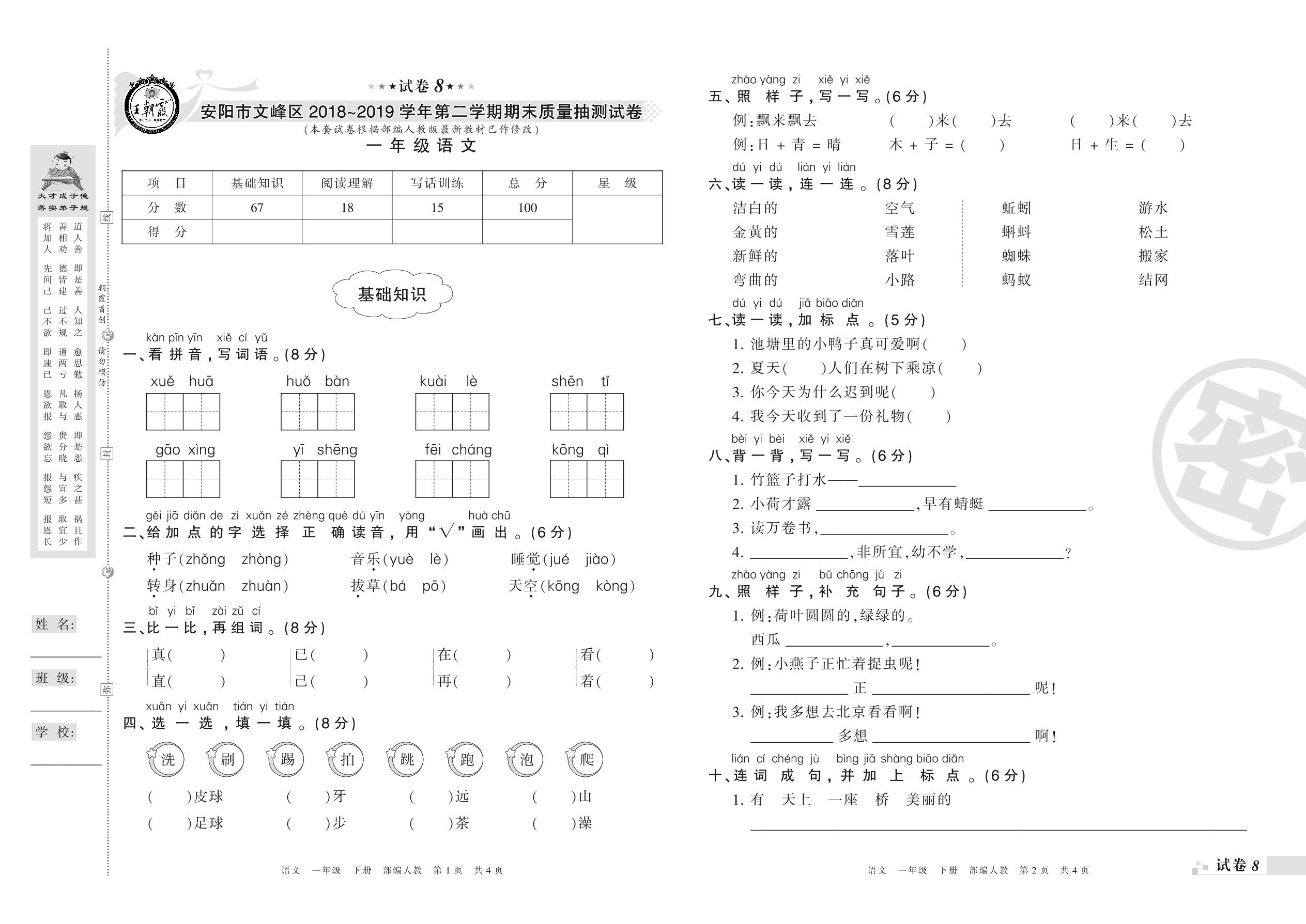 2018-2019学年第二学期安阳市文峰区一年级语文试卷(人教版)【8】
