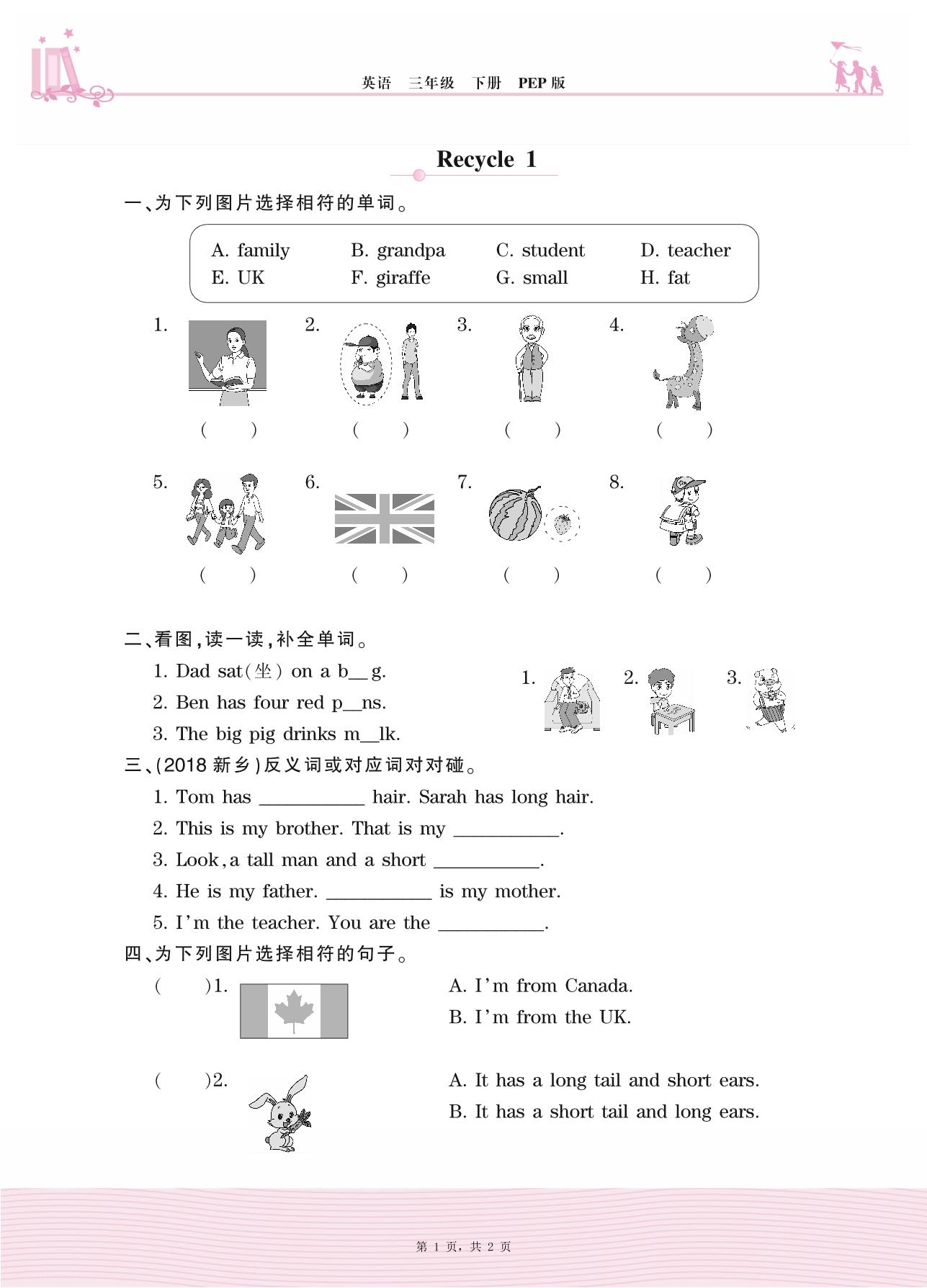 2021下册三年级英语PEP版 Recycle 1