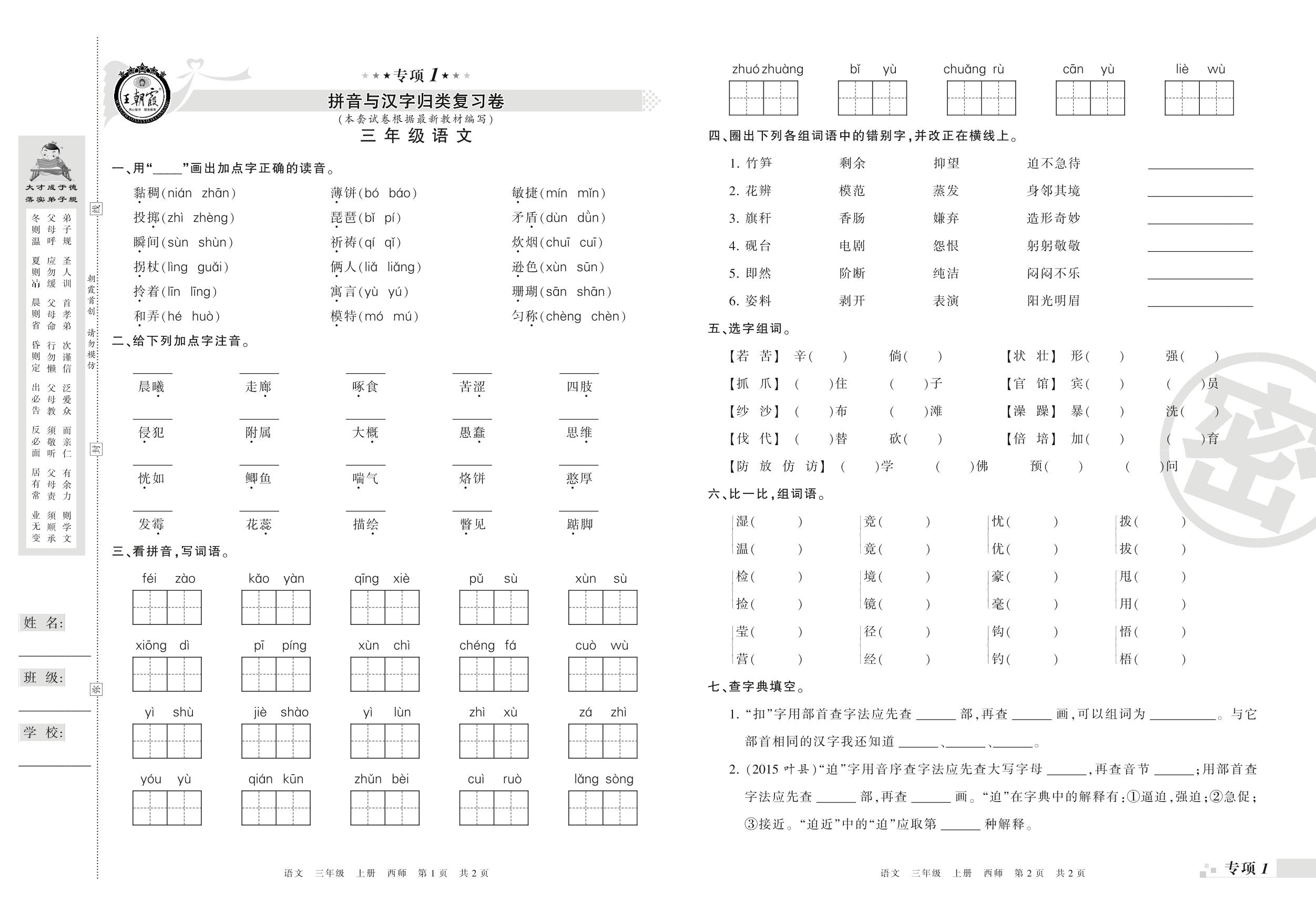 王朝霞期末专项卷——拼音与汉字、词语真题归类复习三年级上册语文(西师版)【0】