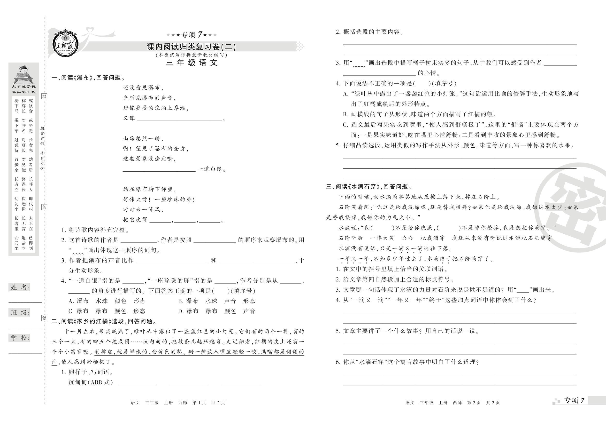 王朝霞期末专项卷——课内阅读、课外阅读与写作真题归类复习三年级上册语文(西师版)【0】